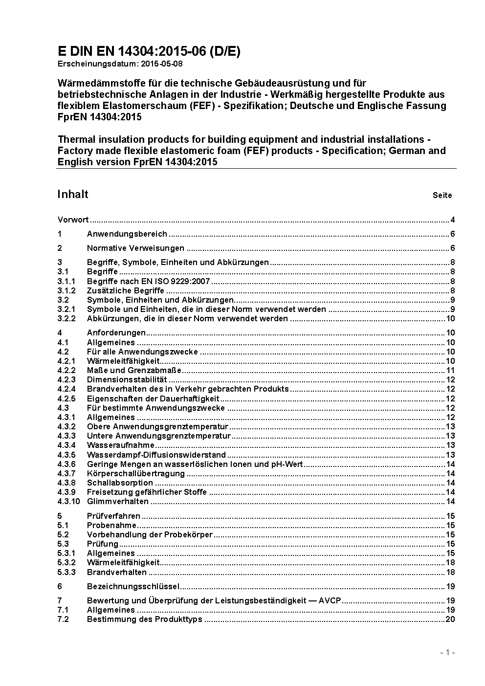 Wärmedämmstoffe für die technische Gebäudeausrüstung und für betriebstechnische Anlagen in der Industrie - Werkmäßig hergestellte Produkte aus flexiblem Elastomerschaum (FEF) - Spezifikation; Deutsche Fassung EN 14304:2009