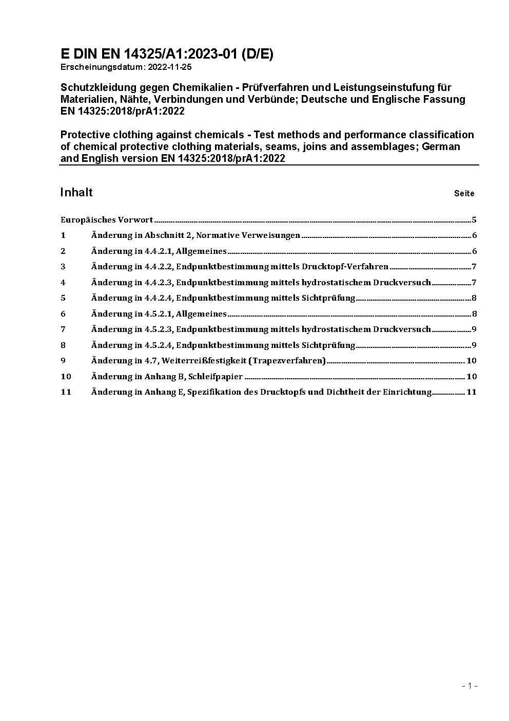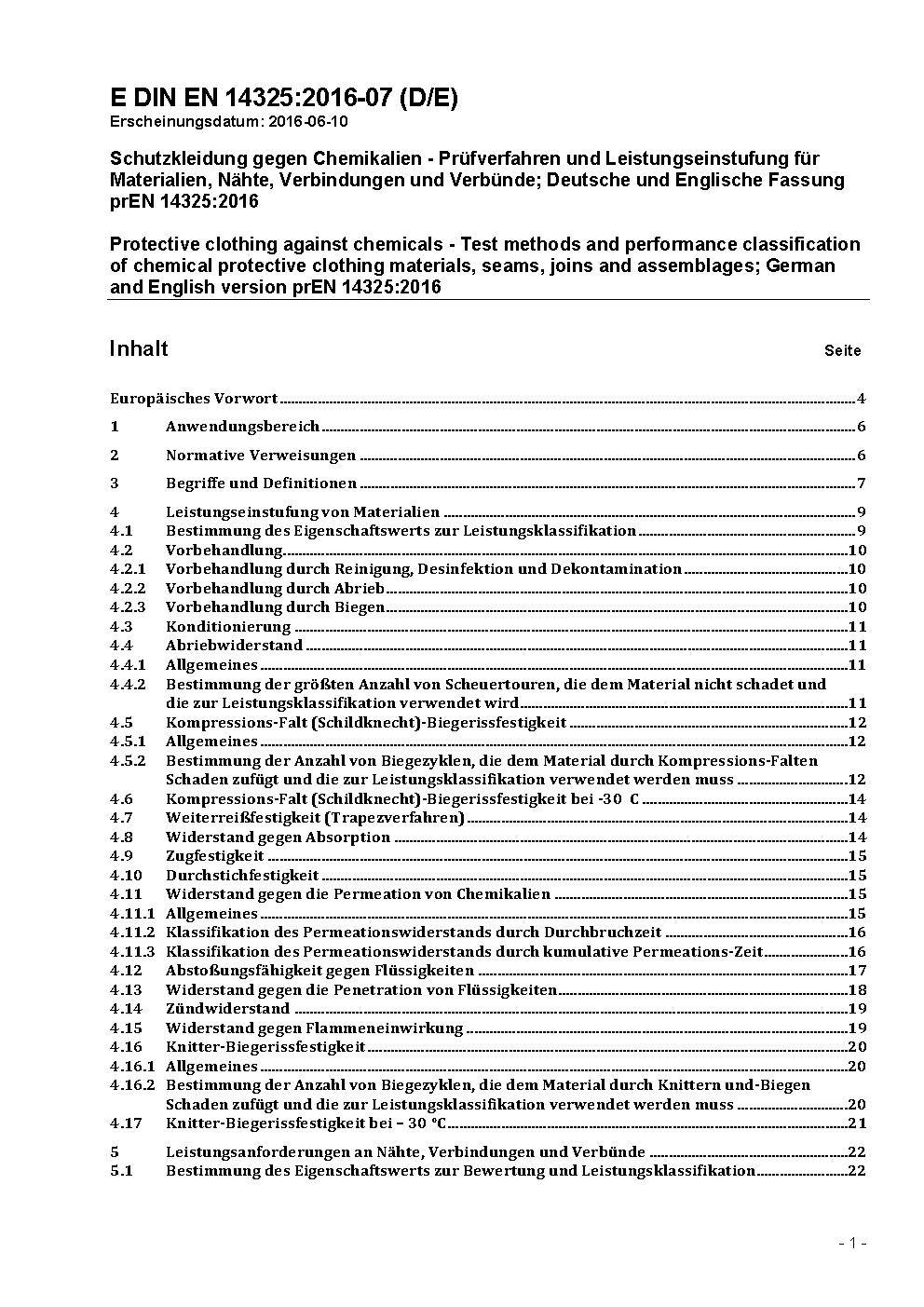 Schutzkleidung gegen Chemikalien - Prüfverfahren und Leistungseinstufung für Materialien, Nähte, Verbindungen und Verbünde; Deutsche Fassung EN 14325:2004