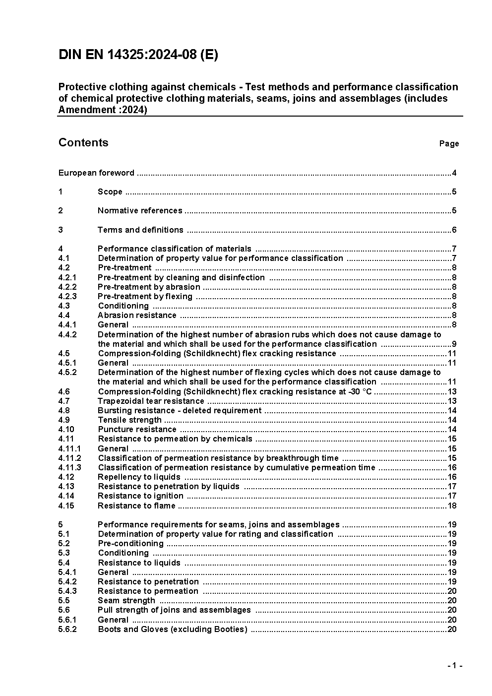 Protective clothing against chemicals - Test methods and performance classification of chemical protective clothing materials, seams, joins and assemblages; German version EN 14325:2004