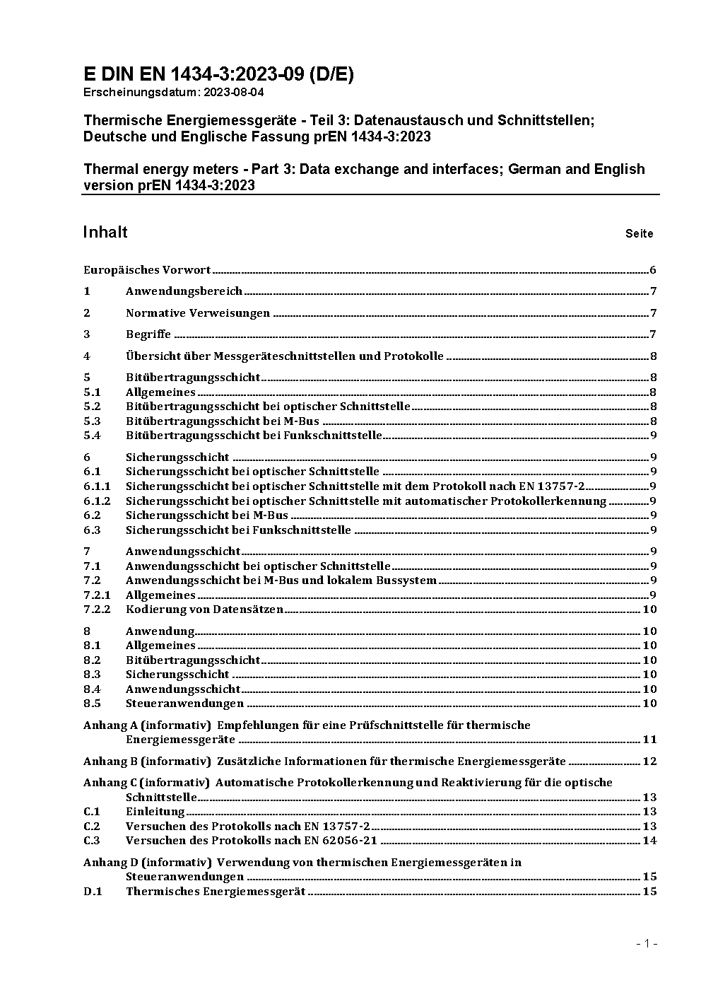 Wärmezähler - Teil 3: Datenaustausch und Schnittstellen; Deutsche und Englische Fassung FprEN 1434-3:2015
