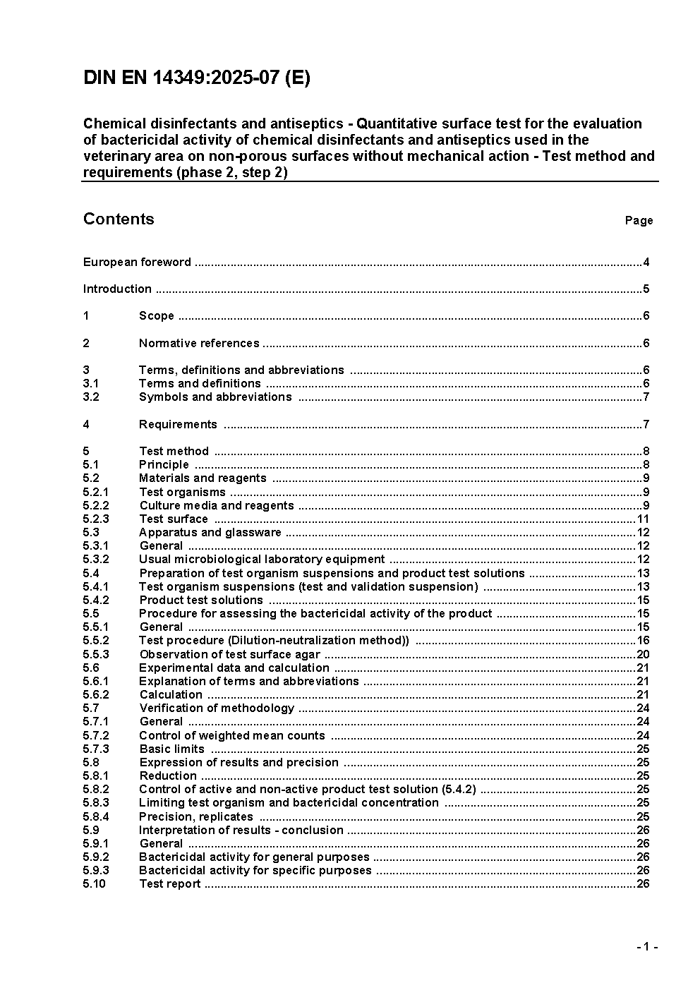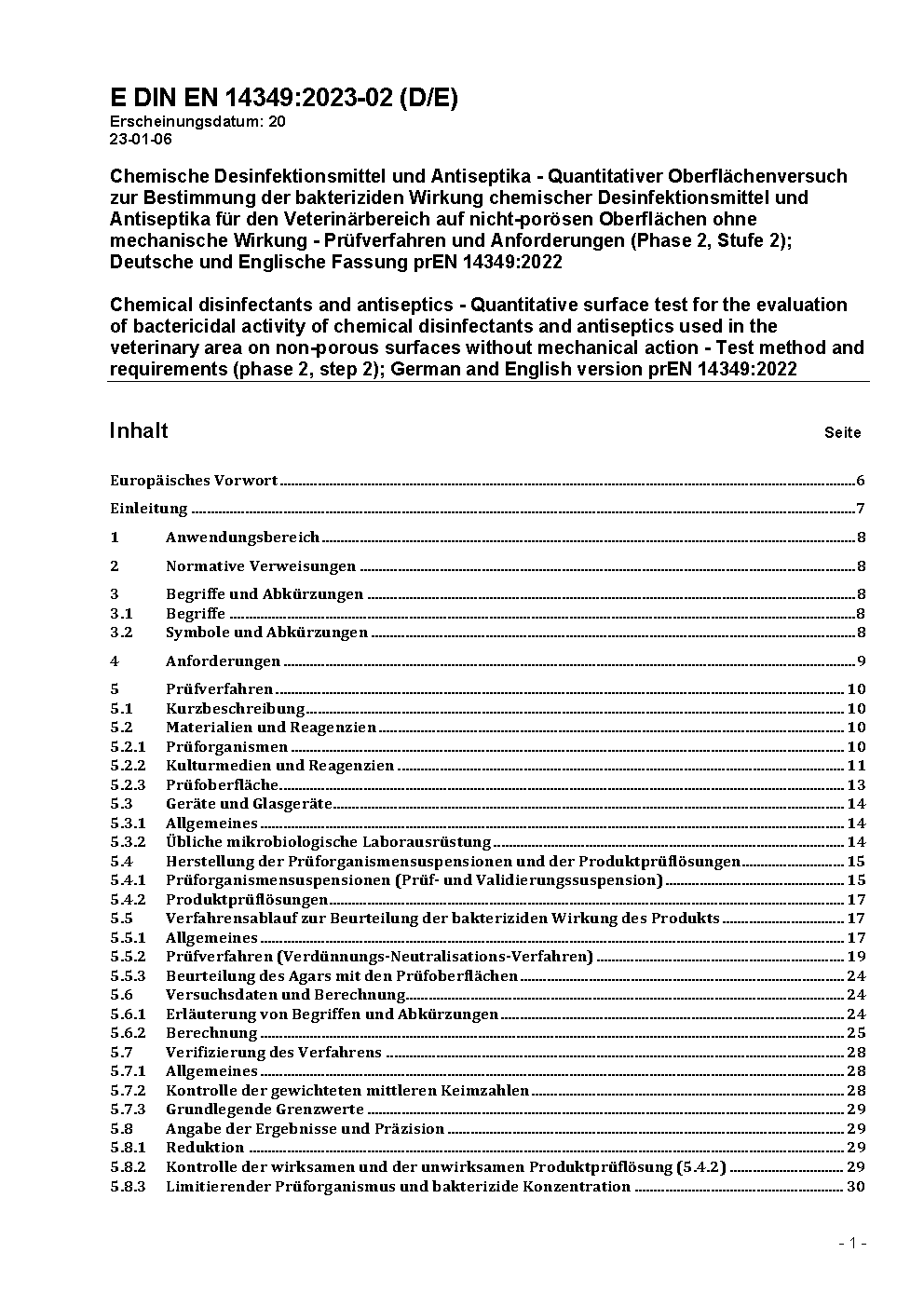 Chemical disinfectants and antiseptics - Quantitative surface test for the evaluation of bactericidal activity of chemical desinfectants and antiseptics used in veterinary field on non-porous surfaces without mechanical action - Test method and requirements (phase 2/step 2); German version prEN 14349:2001