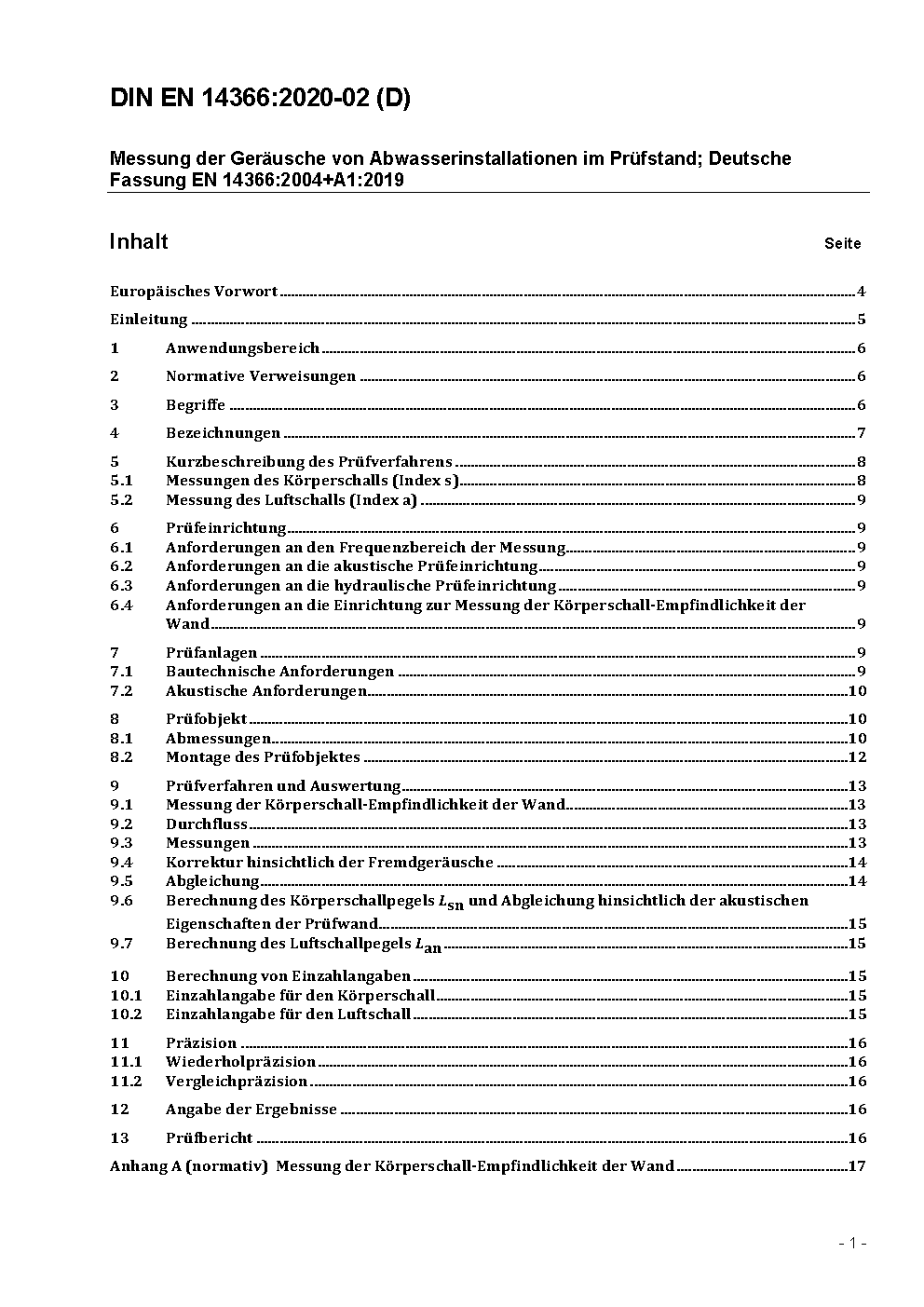 Messung der Geräusche von Abwasserinstallationen im Prüfstand; Deutsche Fassung prEN 14366:2002