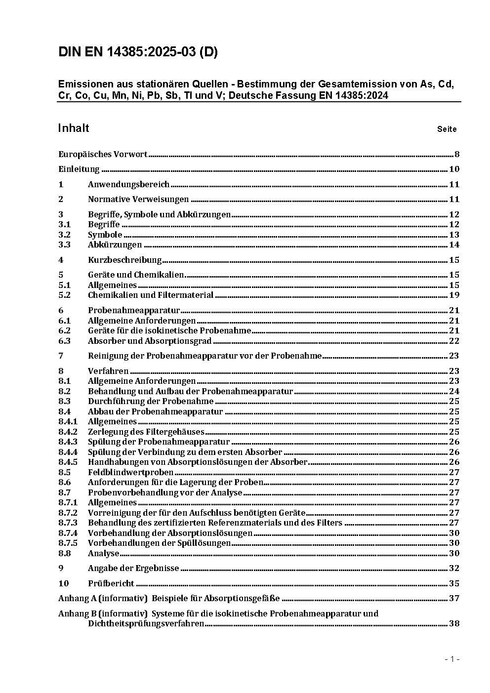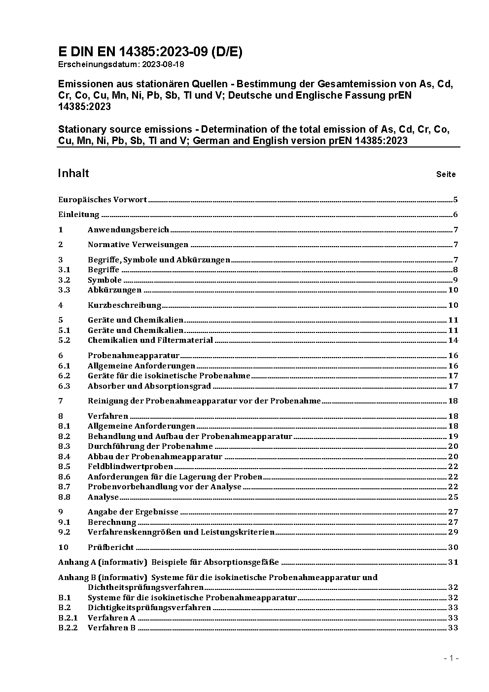 Emissionen aus stationären Quellen - Bestimmung der Gesamtemission von As, Cd, Cr, Co, Cu, Mn, Ni, Pb, Sb, Tl und V; Deutsche und Englische Fassung prEN 14385:2023