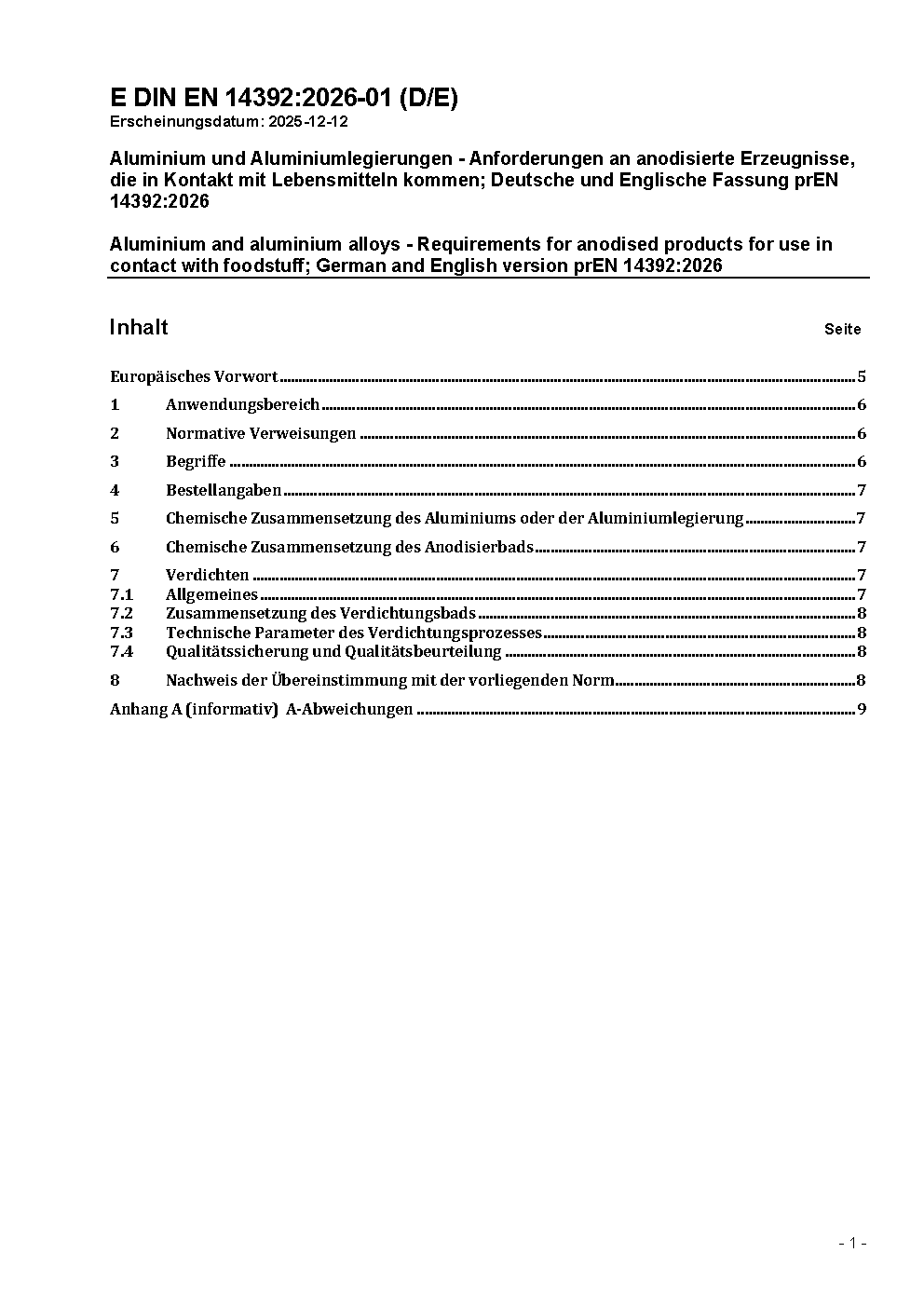 Aluminium und Aluminiumlegierungen - Anforderungen an anodisierte Erzeugnisse, die in Kontakt mit Lebensmitteln kommen; Deutsche Fassung EN 14392:2007