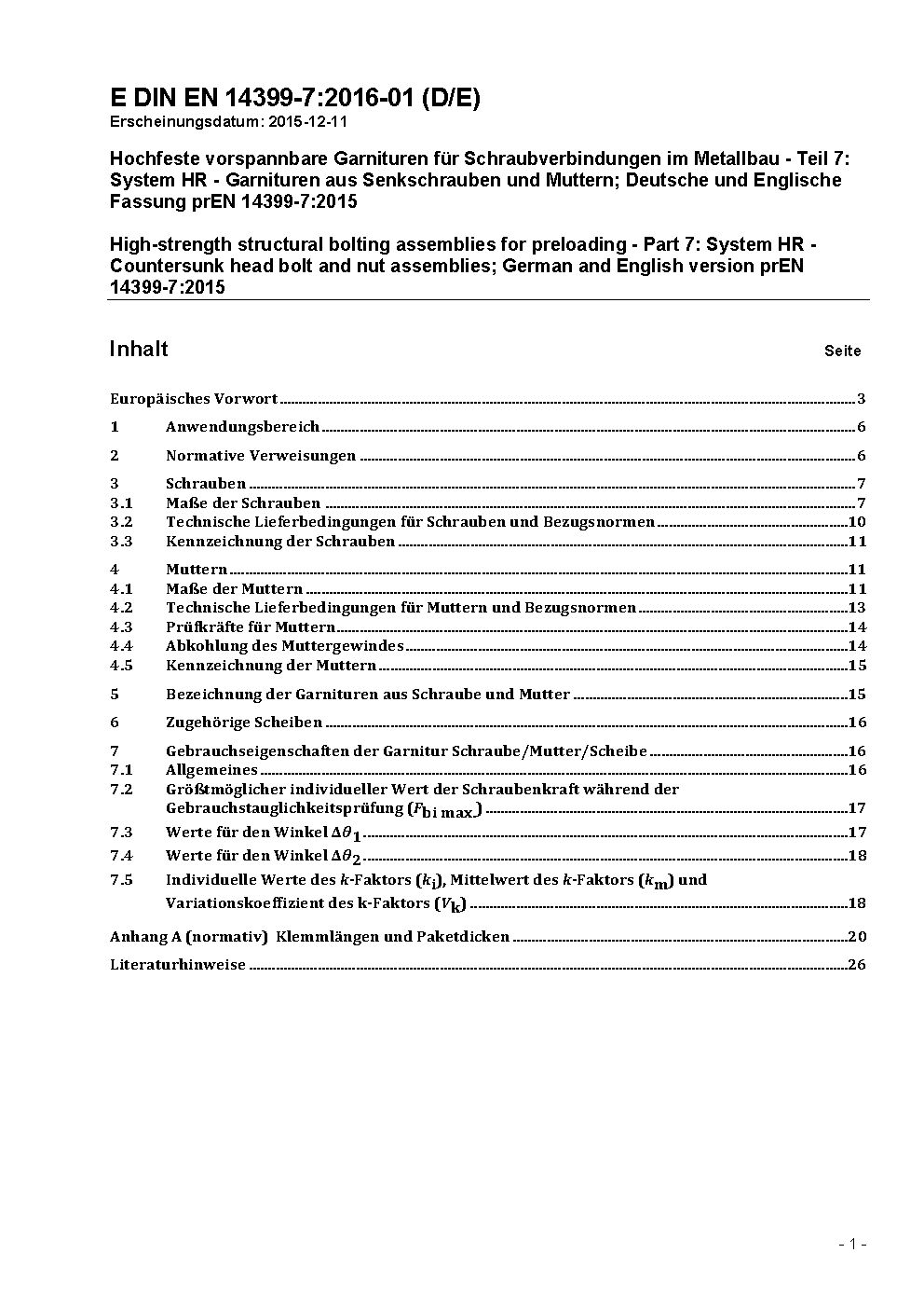 Hochfeste vorspannbare Garnituren für Schraubverbindungen im Metallbau - Teil 7: System HR - Garnituren aus Senkschrauben und Muttern; Deutsche und Englische Fassung prEN 14399-7:2015