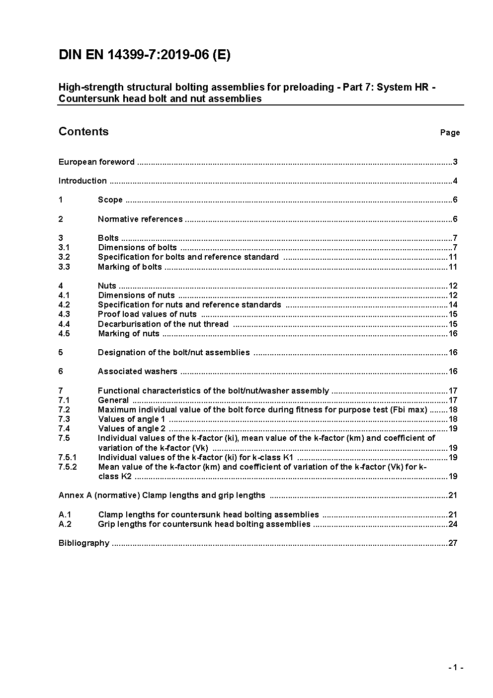 High-strength structural bolting assemblies for preloading - Part 7: System HR - Countersunk head bolt and nut assemblies; German and English version prEN 14399-7:2015