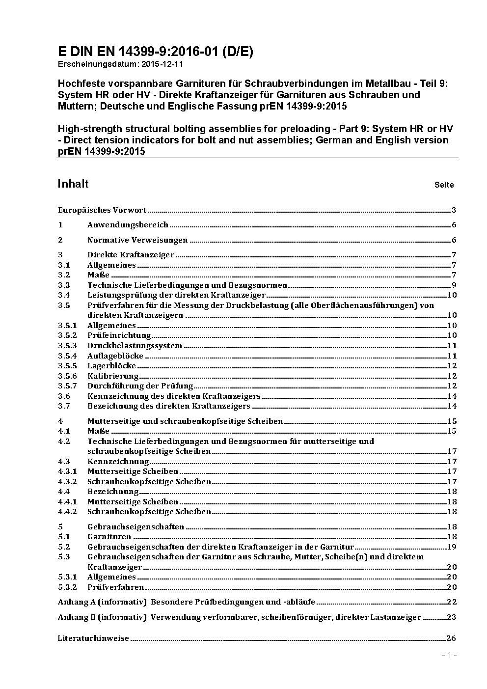 Hochfeste planmäßig vorspannbare Schraubenverbindungen für den Metallbau - Teil 9: System HR oder HV - Direkte Kraftanzeiger für Garnituren aus Schrauben und Muttern; Deutsche Fassung EN 14399-9:2009