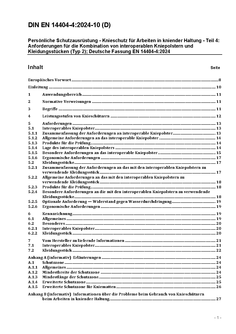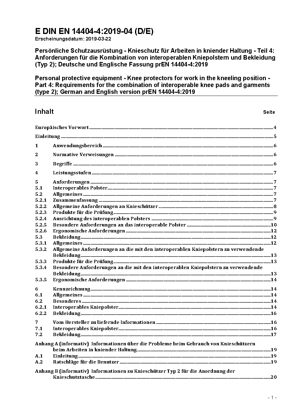 Persönliche Schutzausrüstung - Knieschutz für Arbeiten in kniender Haltung - Teil 4: Anforderungen für die Kombination von interoperablen Kniepolstern und Bekleidung (Typ 2); Deutsche und Englische Fassung prEN 14404-4:2019