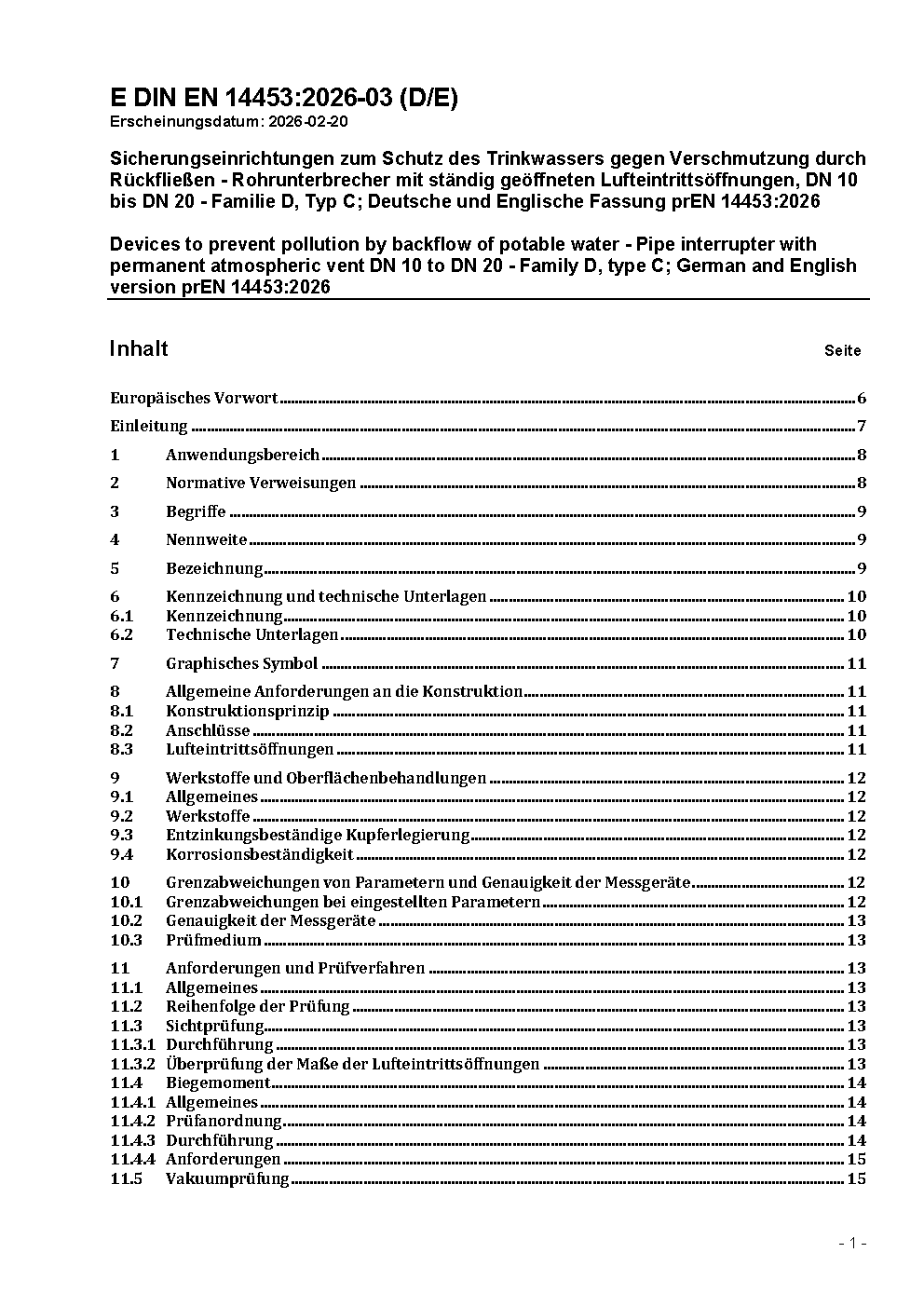 Sicherungseinrichtungen zum Schutz des Trinkwassers gegen Verschmutzung durch Rückfließen - Rohrunterbrecher mit ständig geöffneten Lufteintrittsöffnungen, DN 10 bis DN 20 - Familie D, Typ C; Deutsche Fassung EN 14453:2005