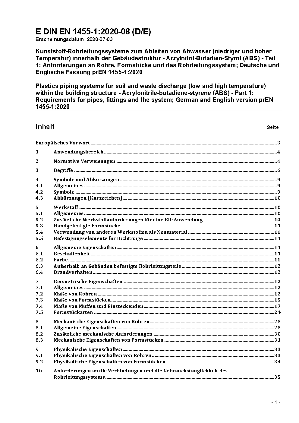 Kunststoff-Rohrleitungssysteme zum Ableiten von Abwasser (niedriger und hoher Temperatur) innerhalb der Gebäudestruktur - Acrylnitril-Butadien-Styrol (ABS) - Teil 1: Anforderungen an Rohre, Formstücke und das Rohrleitungssystem; Deutsche und Englische Fassung prEN 1455-1:2020