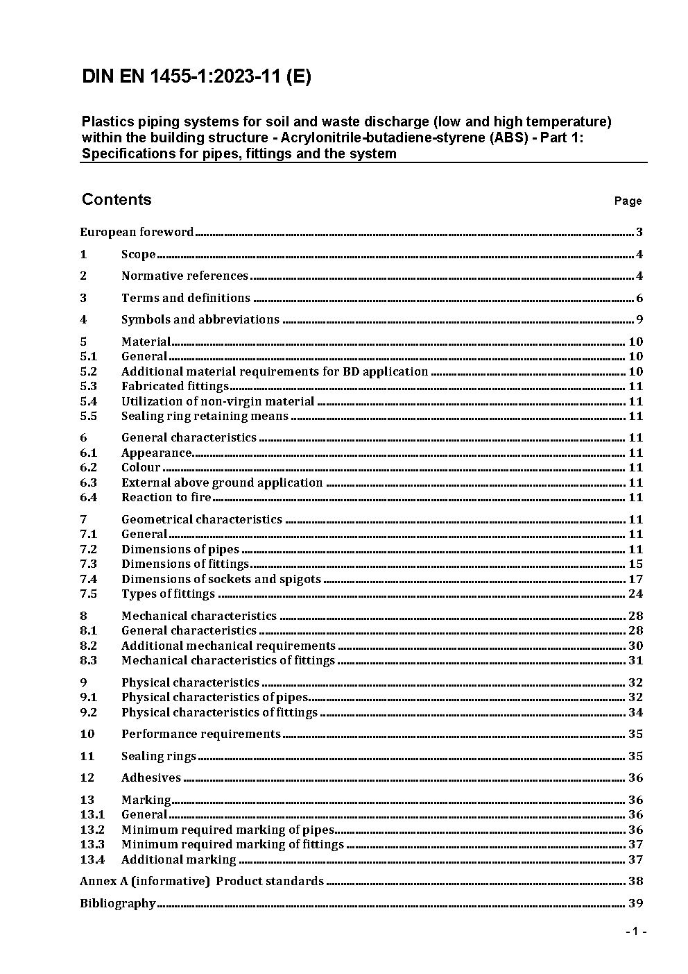 Plastics piping systems for soil and waste discharge (low and high temperature) within the building structure - Acrylonitrile-butadiene-styrene (ABS) - Part 1: Requirements for pipes, fittings and the system; German and English version prEN 1455-1:2020