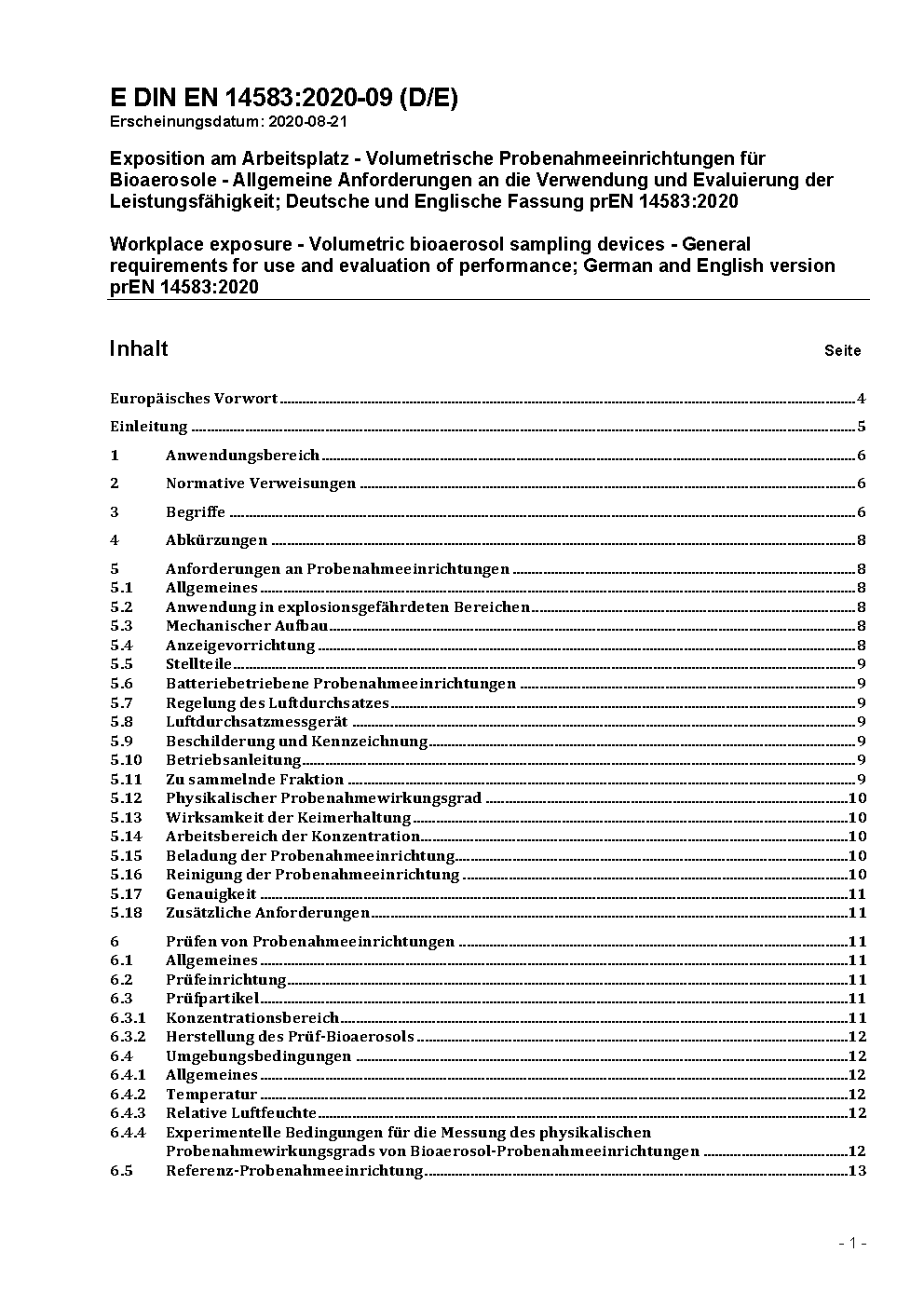 Exposition am Arbeitsplatz - Volumetrische Sammler für Bioaerosole - Allgemeine Anforderungen und Bewertung der Leistungsfähigkeit; Deutsche Fassung EN 14583:2021