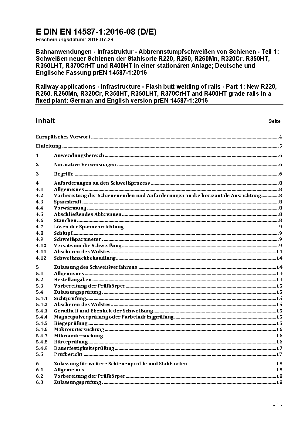 Bahnanwendungen - Oberbau - Abbrennstumpfschweißen von Schienen - Teil 1: Schweißen neuer Schienen der Stahlsorte R220, R260, R260Mn und R350HT in einer stationären Anlage; Deutsche Fassung EN 14587-1:2007