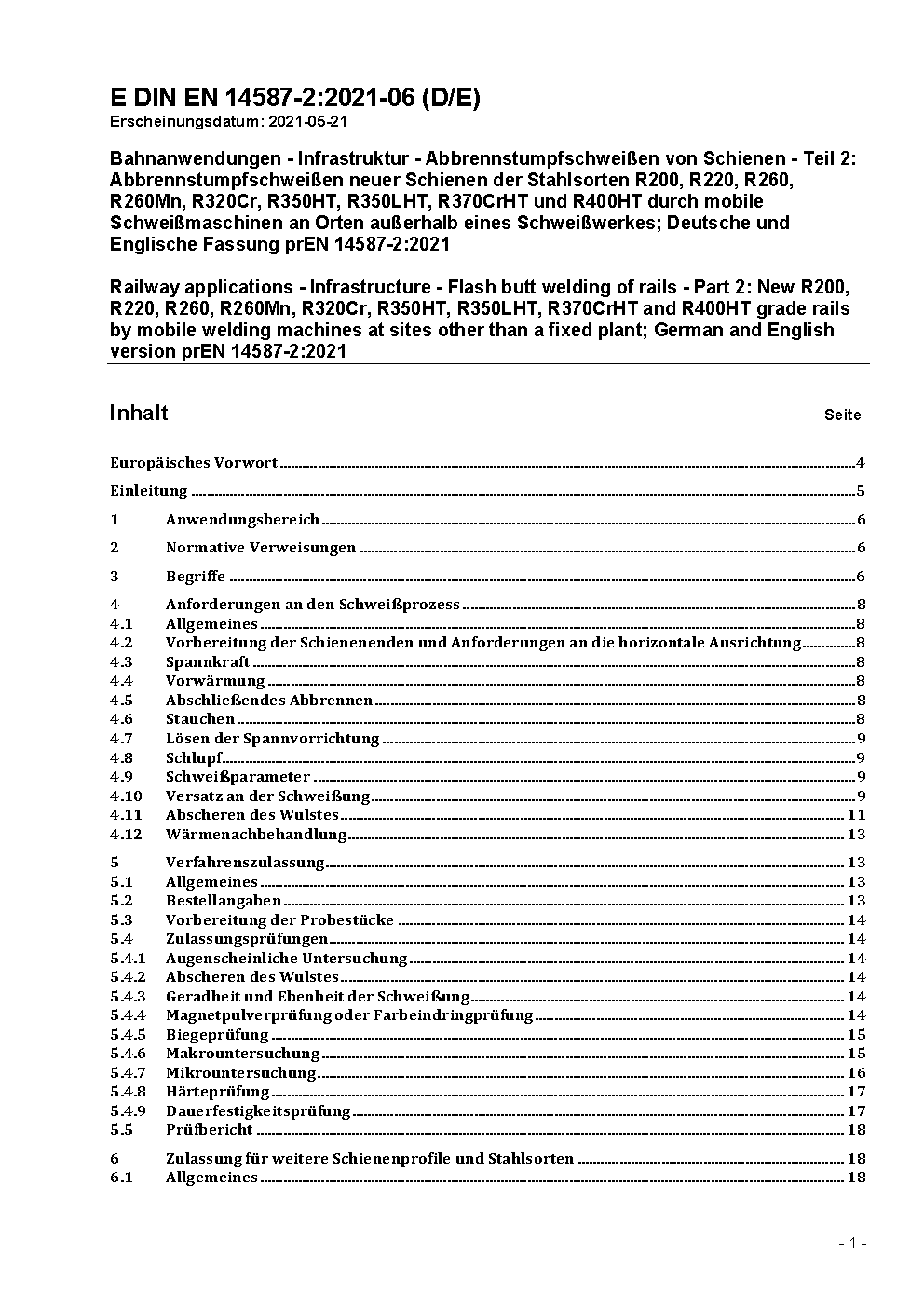 Bahnanwendungen - Oberbau - Abbrennstumpfschweißen von Schienen - Teil 2: Abbrennstumpfschweißen neuer Schienen der Stahlsorten R220, R260, R260Mn und R350HT durch mobile Schweißmaschinen an Orten außerhalb eines Schweißwerkes; Deutsche Fassung EN 14587-2:2009