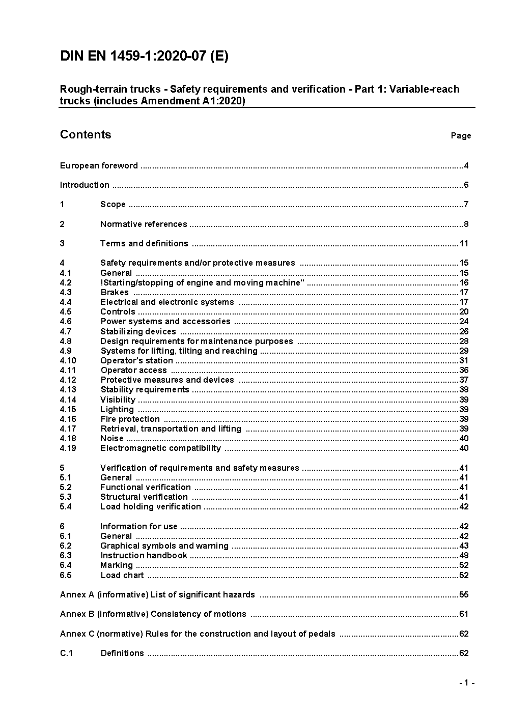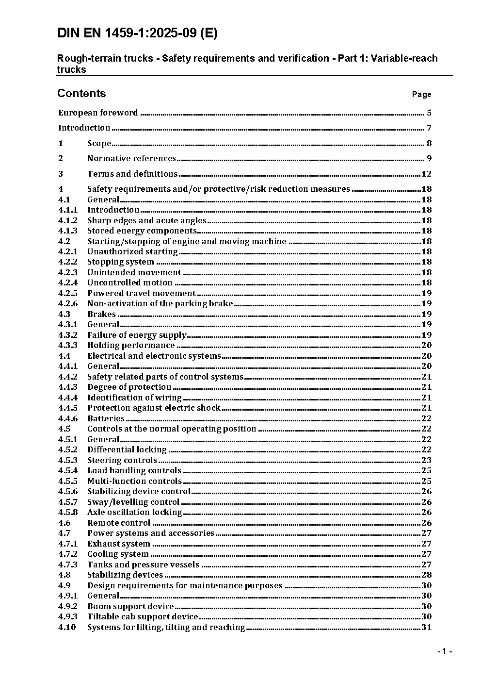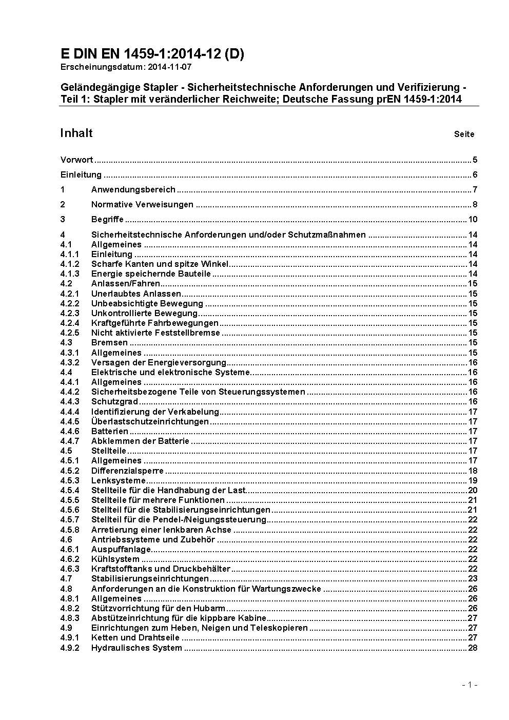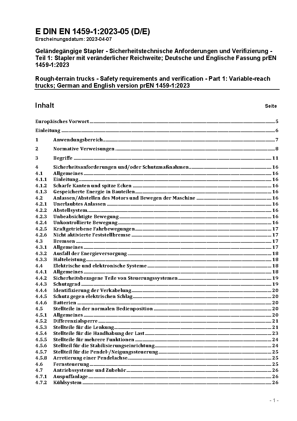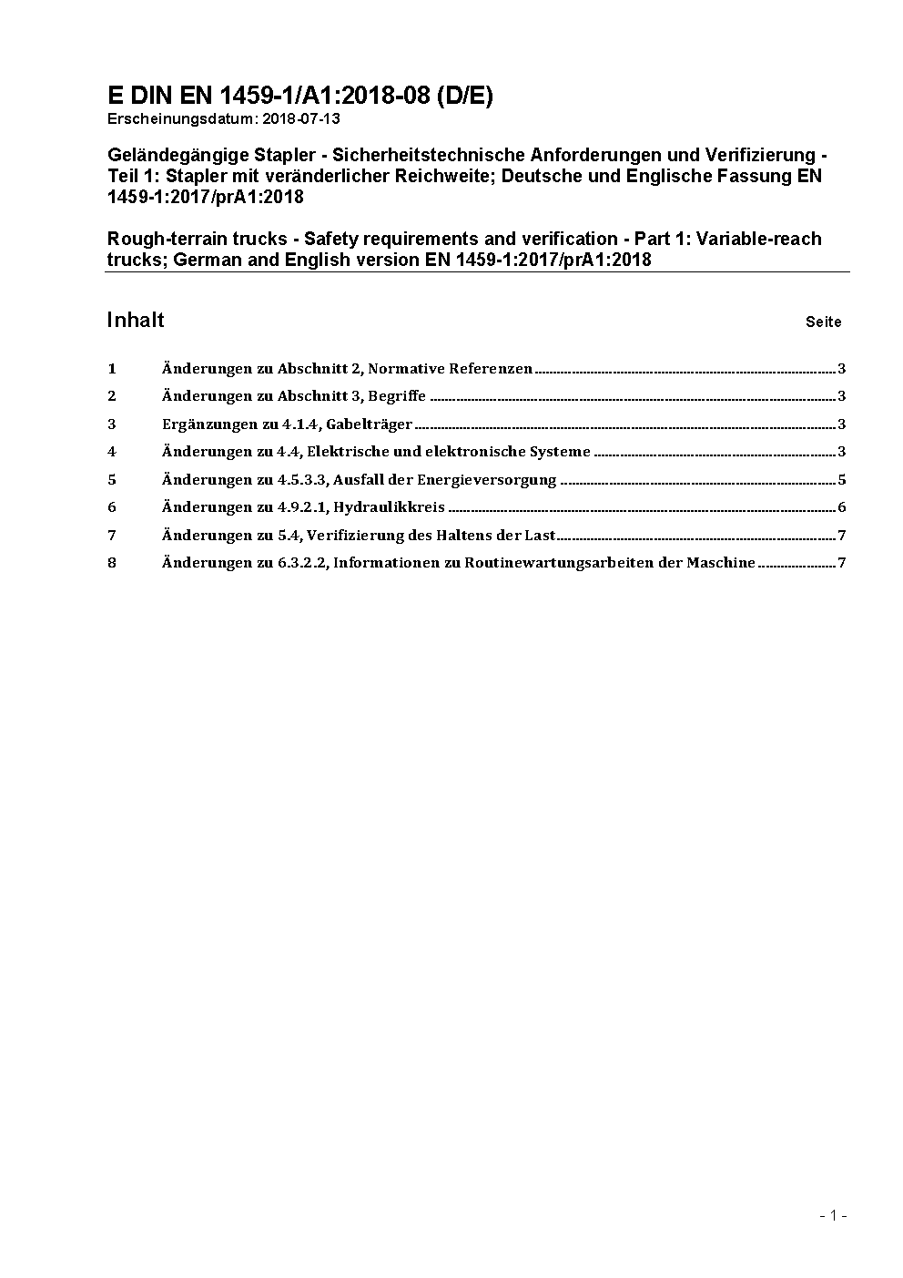 Rough-terrain trucks - Safety requirements and verification - Part 1: Variable-reach trucks; German version prEN 1459-1:2013