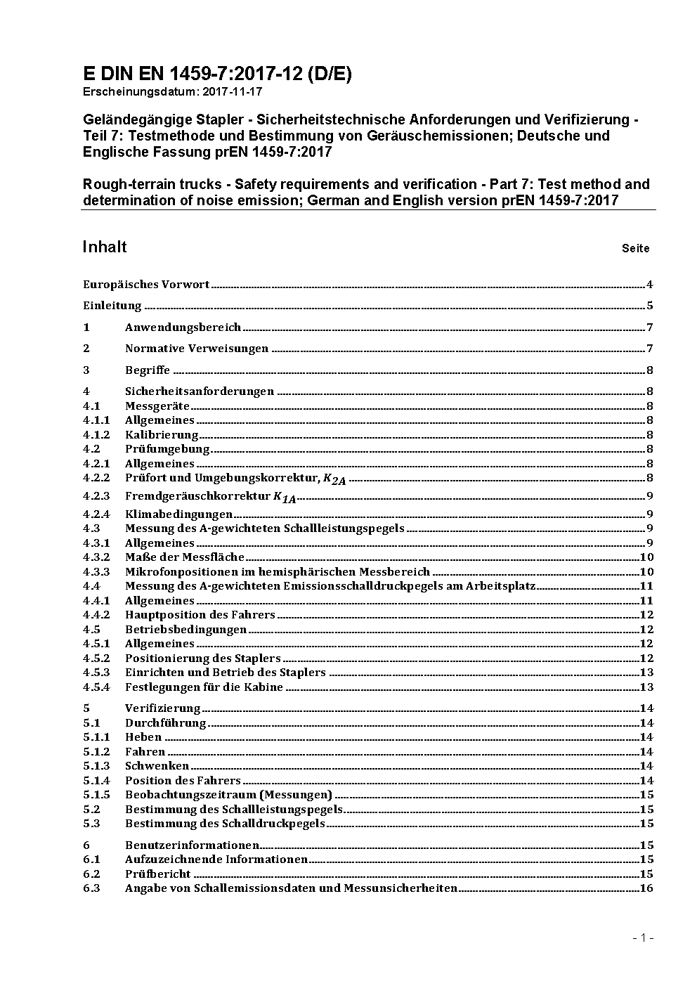 Geländegängige Stapler - Sicherheitstechnische Anforderungen und Verifizierung - Teil 7: Testmethode und Bestimmung von Geräuschemissionen; Deutsche und Englische Fassung prEN 1459-7:2017