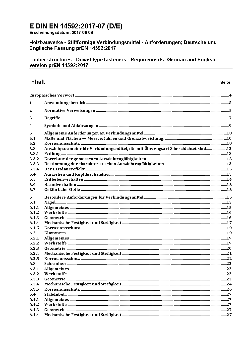 Holzbauwerke - Stiftförmige Verbindungsmittel - Anforderungen; Deutsche und Englische Fassung prEN 14592:2017