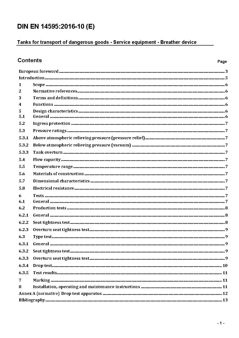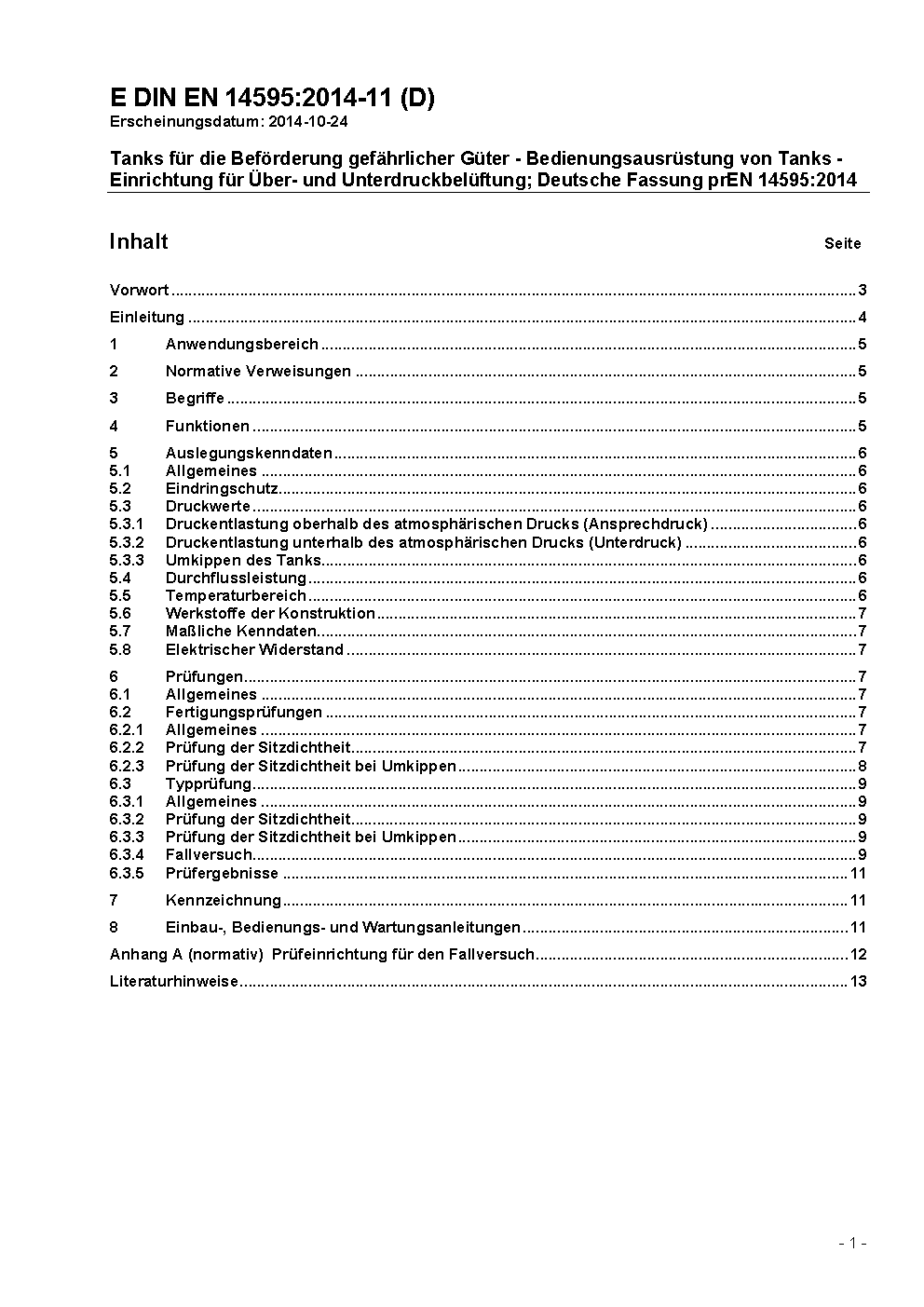 Tanks für die Beförderung gefährlicher Güter - Bedienungsausrüstung von Tanks - Über- und Unterdruckbelüftung; Deutsche Fassung EN 14595:2005