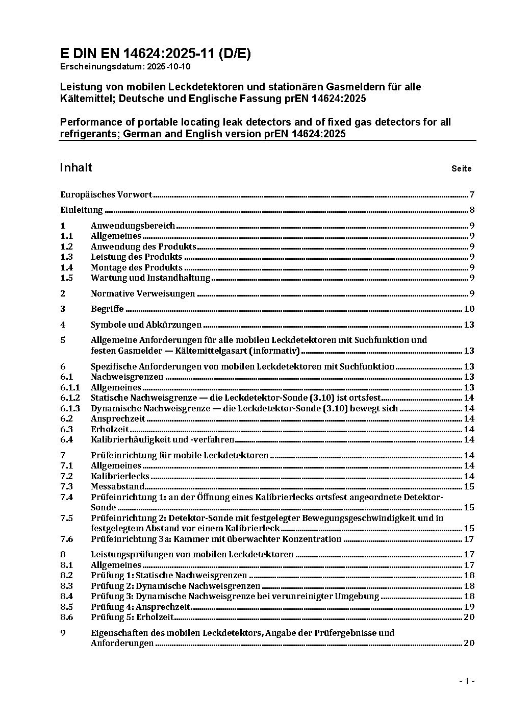 Leistung von mobilen Leckdetektoren und Raumüberwachungsgeräten für halogenierte Kältemittel; Deutsche Fassung EN 14624:2012