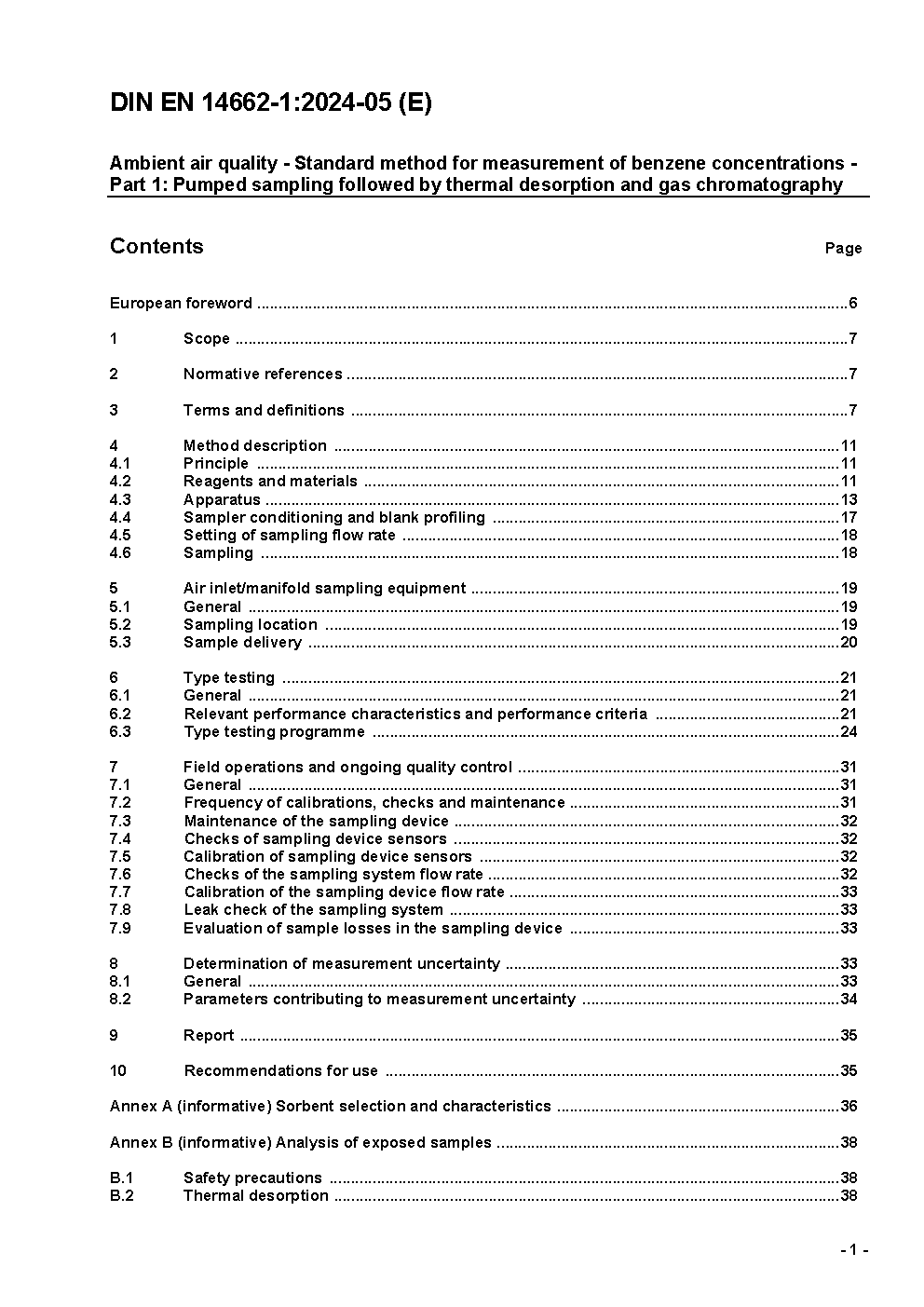 Ambient air quality - Standard method for measurement of benzene concentrations - Part 1: Pumped sampling followed by thermal desorption and gas chromatography; German and English version prEN 14662-1:2022