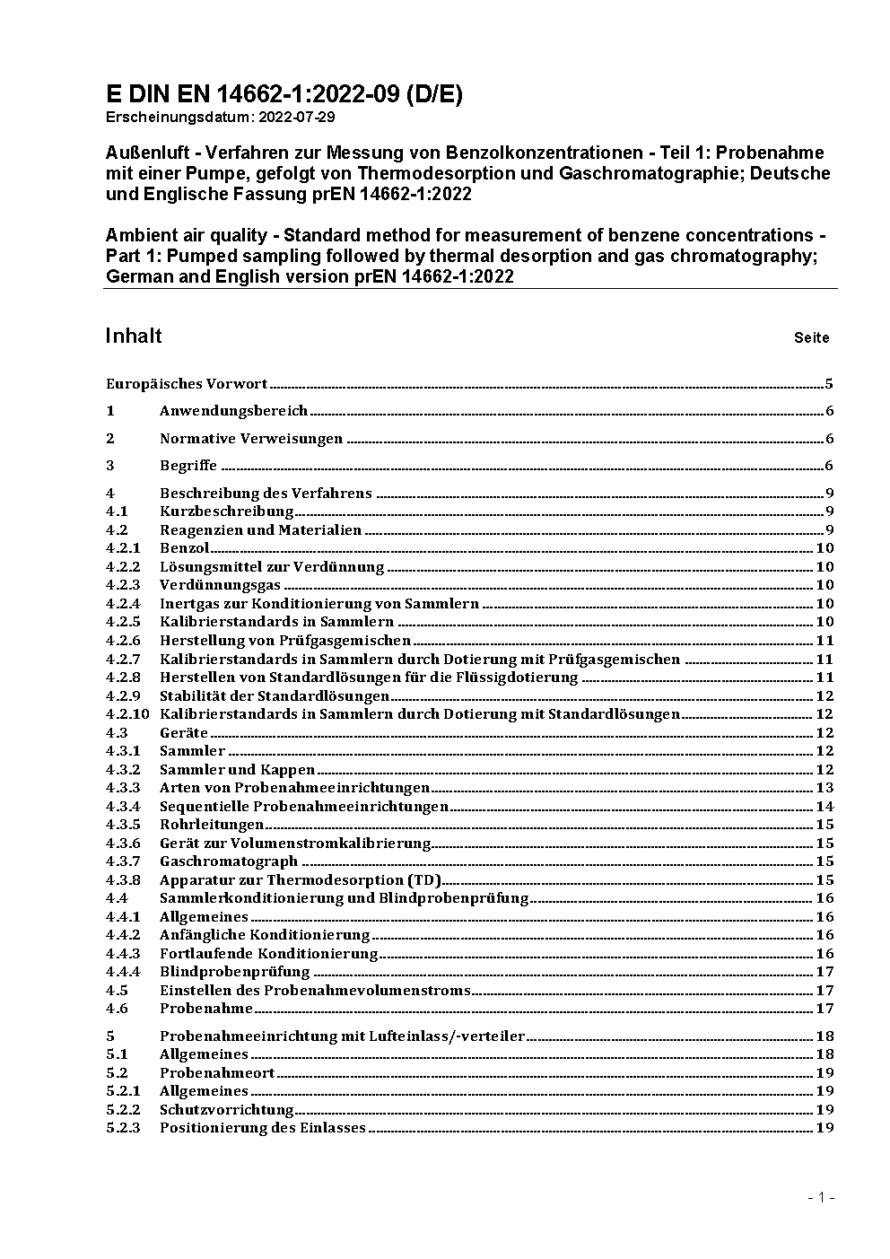 Außenluft - Verfahren zur Messung von Benzolkonzentrationen - Teil 1: Probenahme mit einer Pumpe, gefolgt von Thermodesorption und Gaschromatographie; Deutsche und Englische Fassung prEN 14662-1:2022