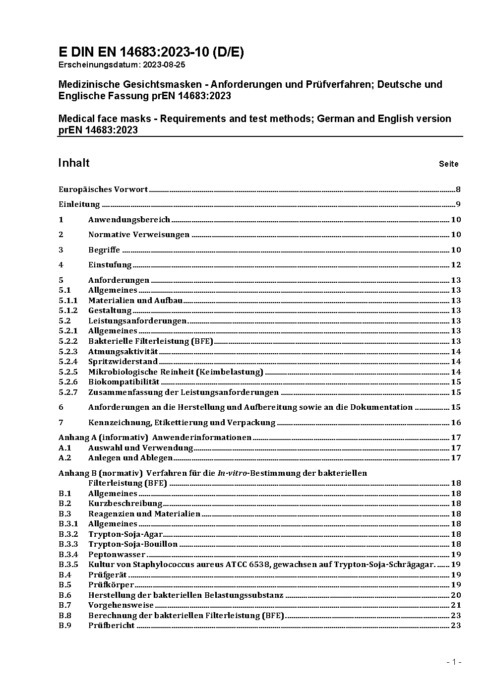 Surgical masks - Requirements and test methods; German version EN 14683:2005