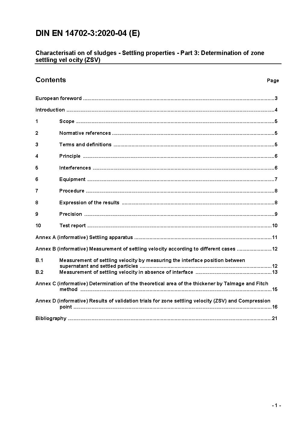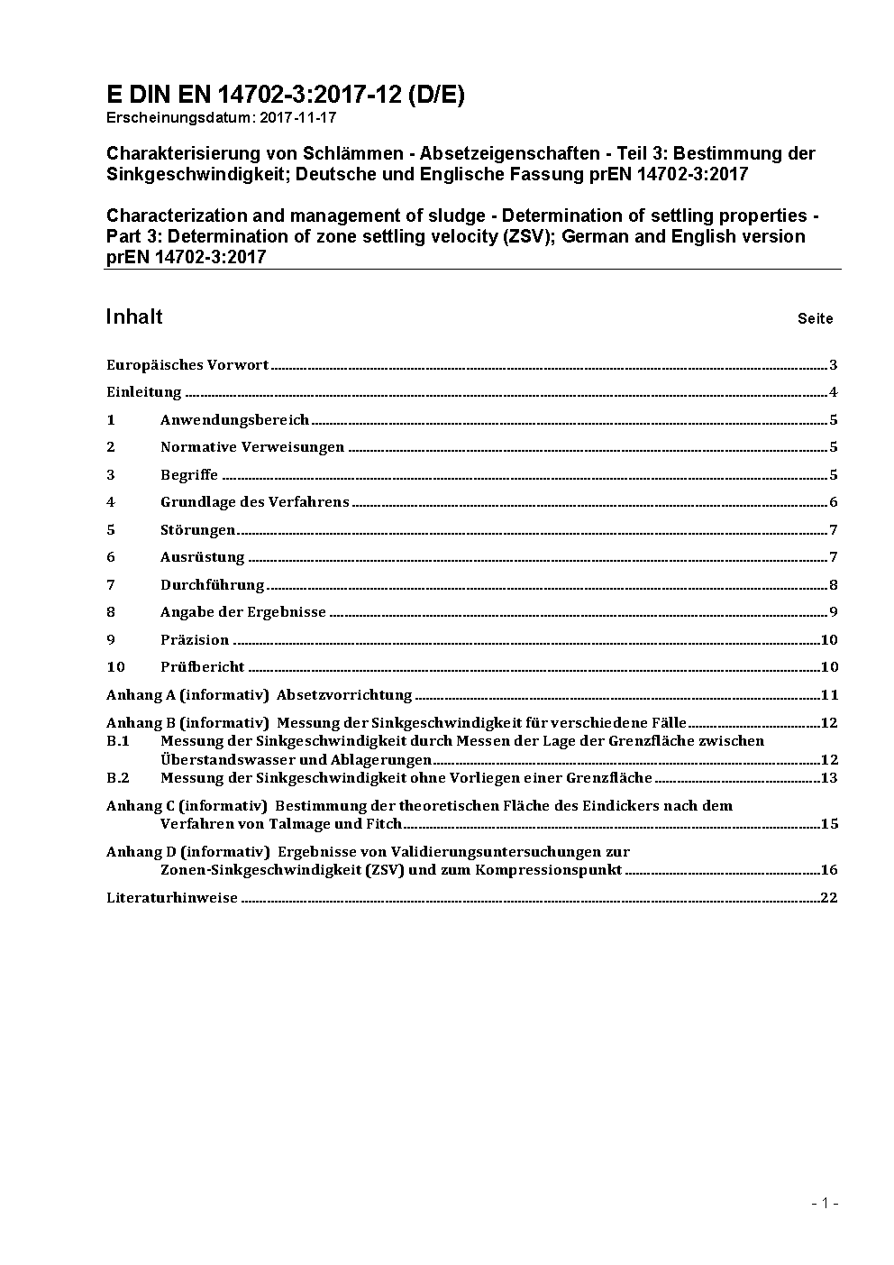 Characterization and management of sludge - Determination of settling properties - Part 3: Determination of zone settling velocity (ZSV); German and English version prEN 14702-3:2017