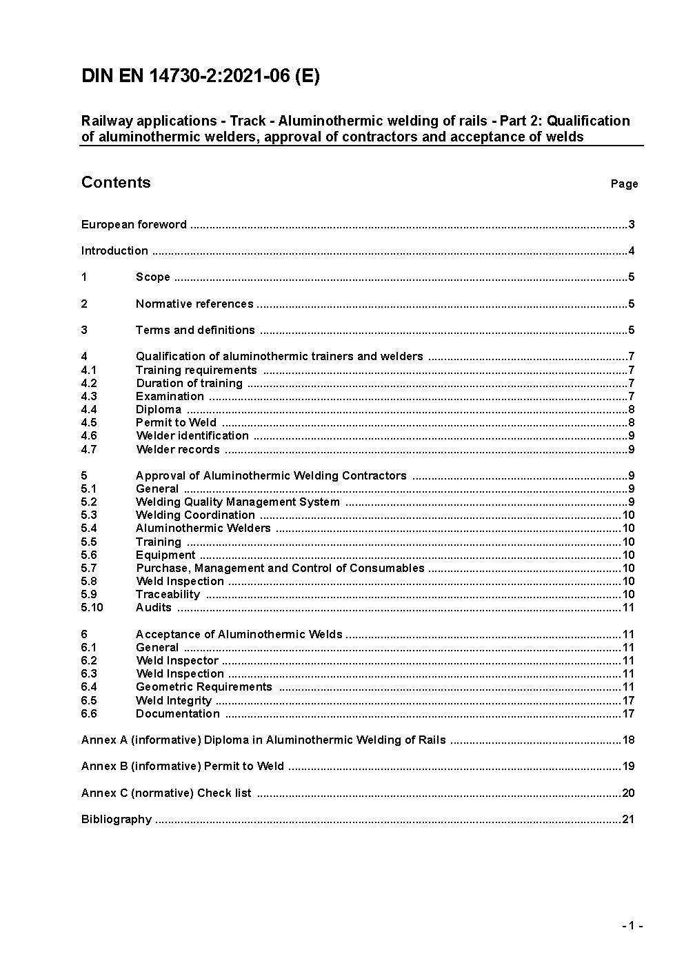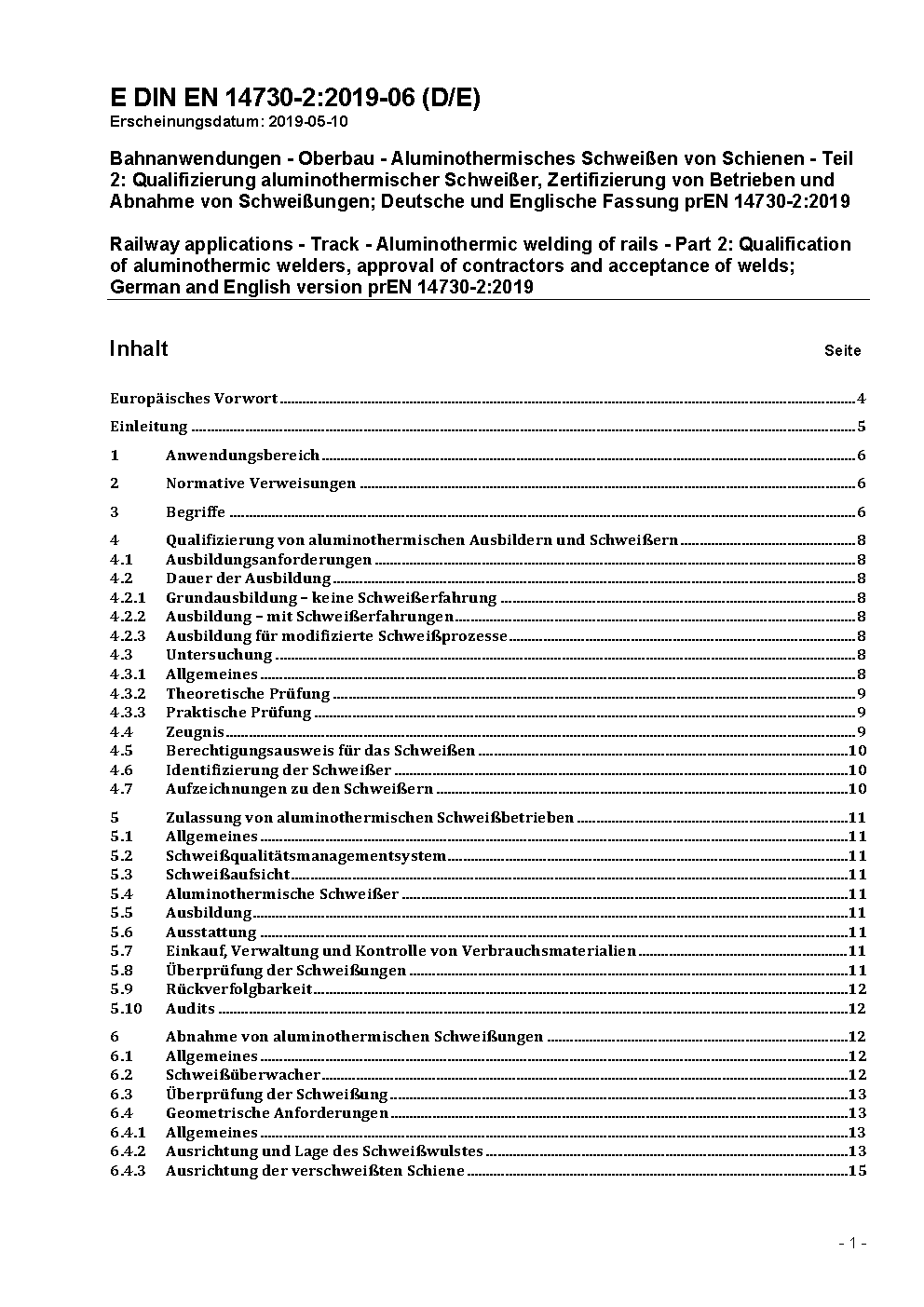 Bahnanwendungen - Oberbau - Aluminothermisches Schweißen von Schienen - Teil 2: Qualifizierung aluminothermischer Schweißer, Zertifizierung von Betrieben und Abnahme von Schweißungen; Deutsche Fassung EN 14730-2:2006
