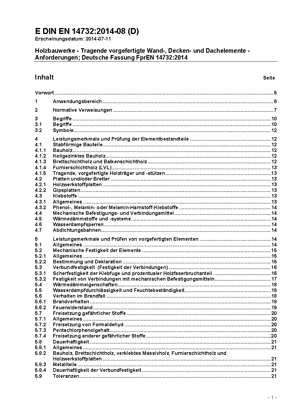 Holzbauwerke - Tragende vorgefertigte Wand-, Decken- und Dachelemente - Anforderungen; Deutsche Fassung FprEN 14732:2014