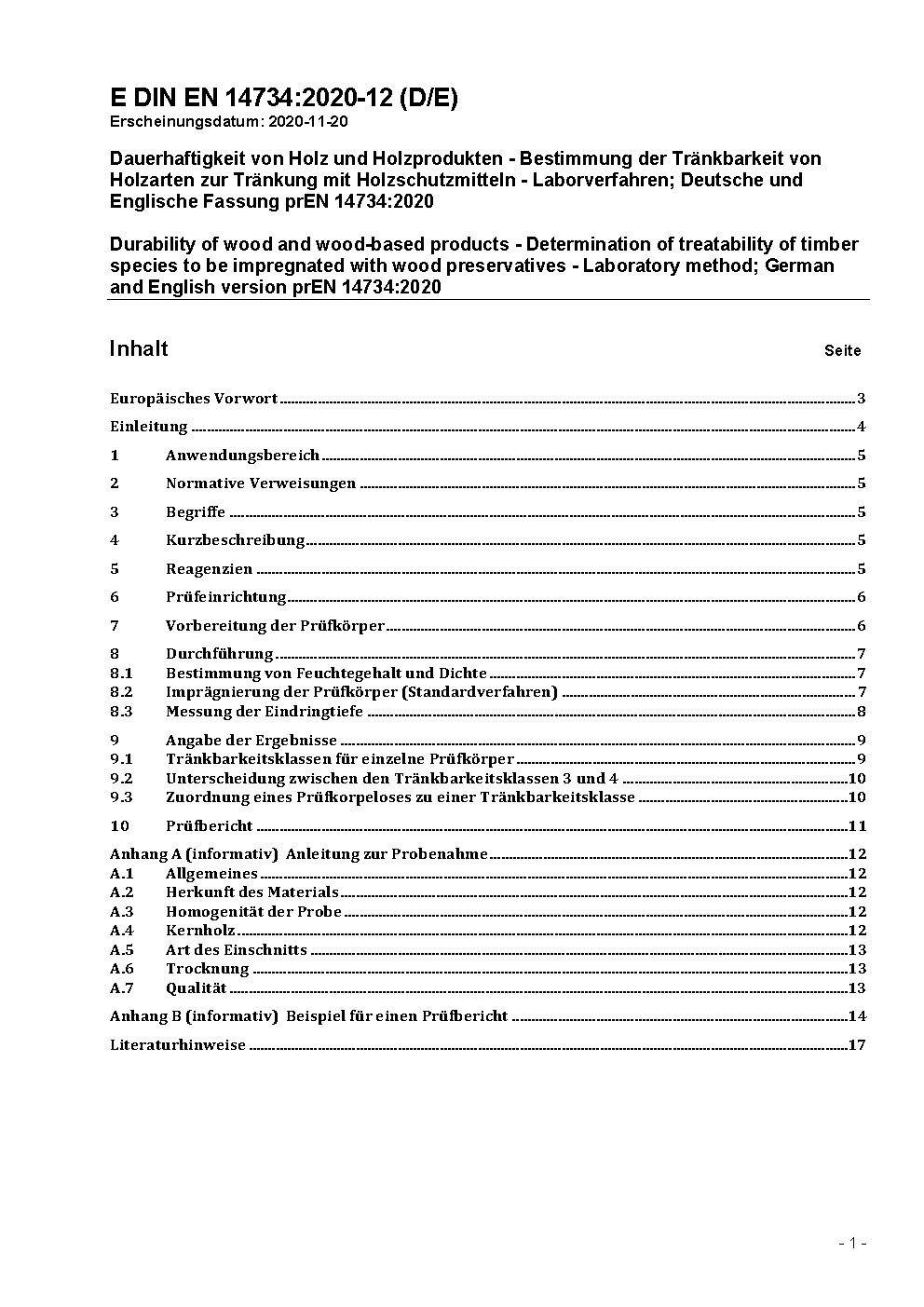 Dauerhaftigkeit von Holz und Holzprodukten - Bestimmung der Tränkbarkeit von Holzarten zur Tränkung mit Holzschutzmitteln - Laborverfahren; Deutsche Fassung EN 14734:2022 + AC:2023