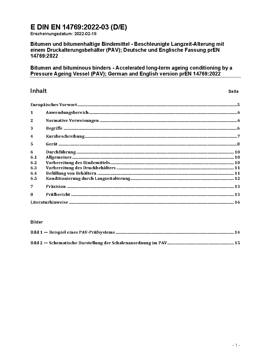 Bitumen und bitumenhaltige Bindemittel - Beschleunigte Langzeitalterung mit einem Druckalterungsbehälter (PAV); Deutsche Fassung EN 14769:2023