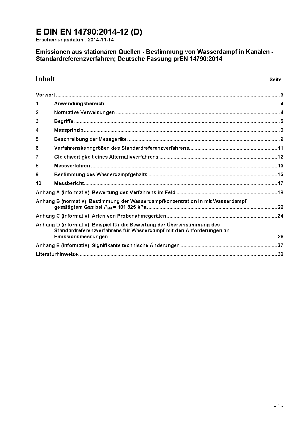 Emissionen aus stationären Quellen - Bestimmung von Wasserdampf in Leitungen; Deutsche Fassung EN 14790:2005