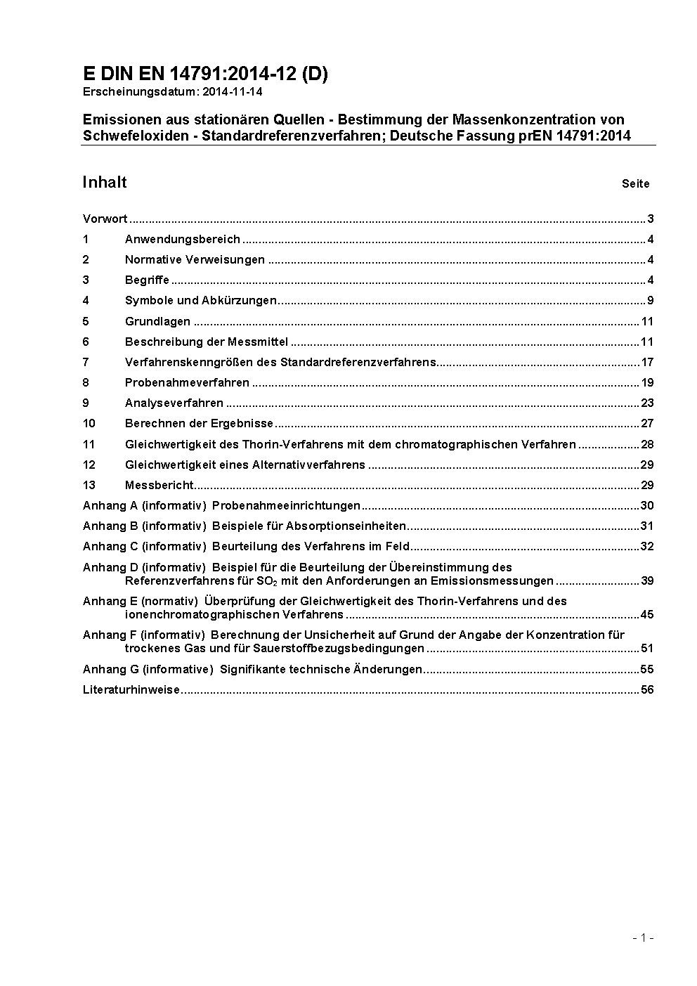 Emissionen aus stationären Quellen - Bestimmung der Massenkonzentration von Schwefeldioxid - Referenzverfahren; Deutsche Fassung EN 14791:2005