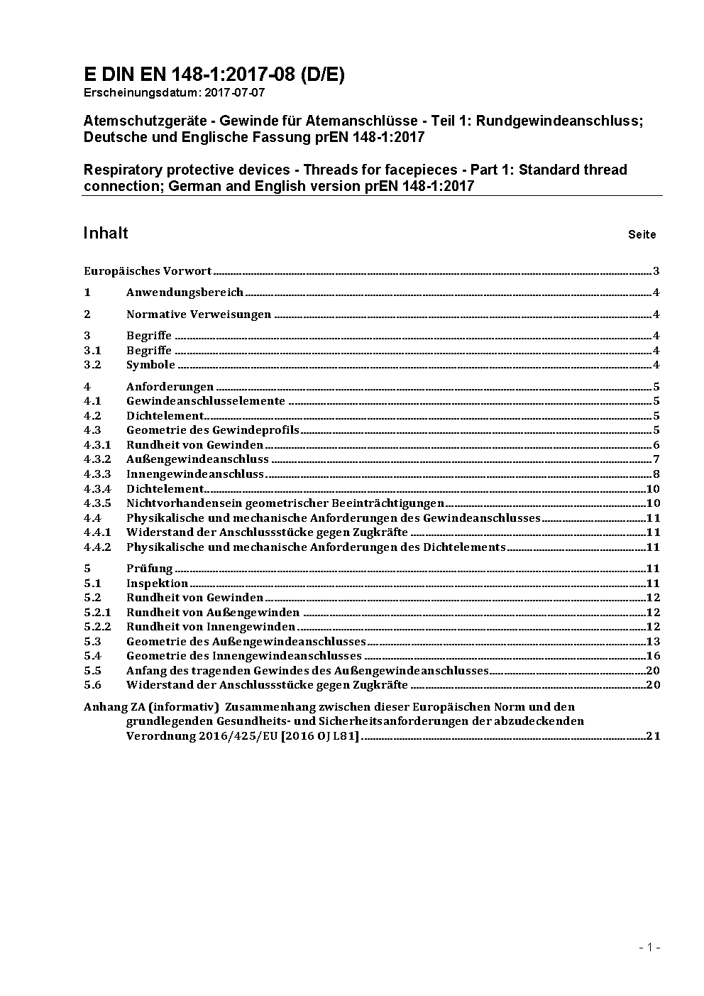 Respiratory protective devices - Threads for facepieces - Part 1: Standard thread connection; German and English version prEN 148-1:2017