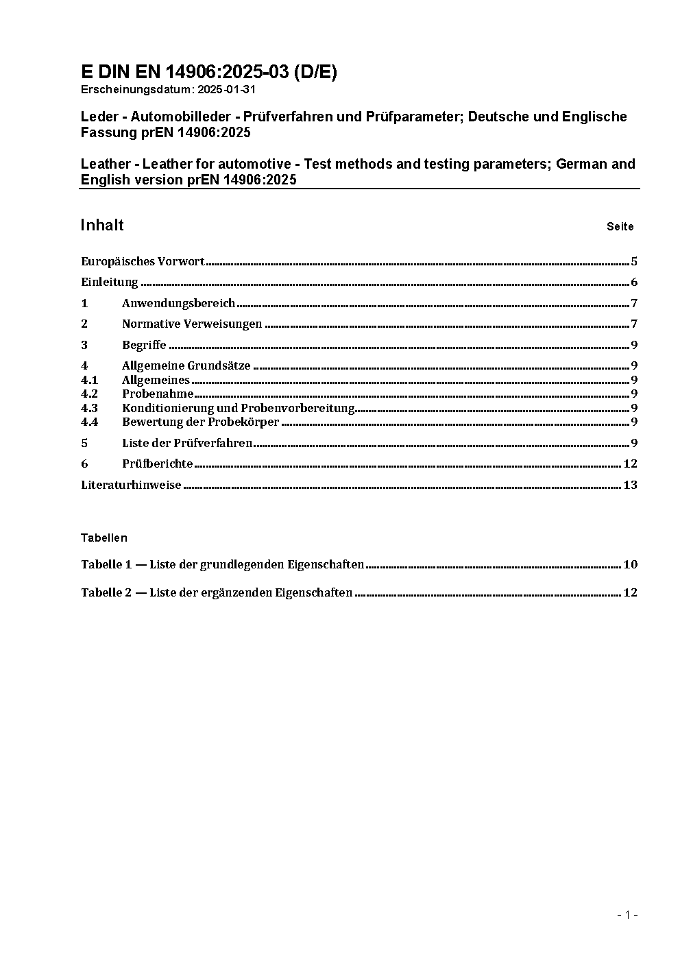 Leder - Automobilleder - Prüfverfahren und Prüfparameter; Deutsche Fassung EN 14906:2012