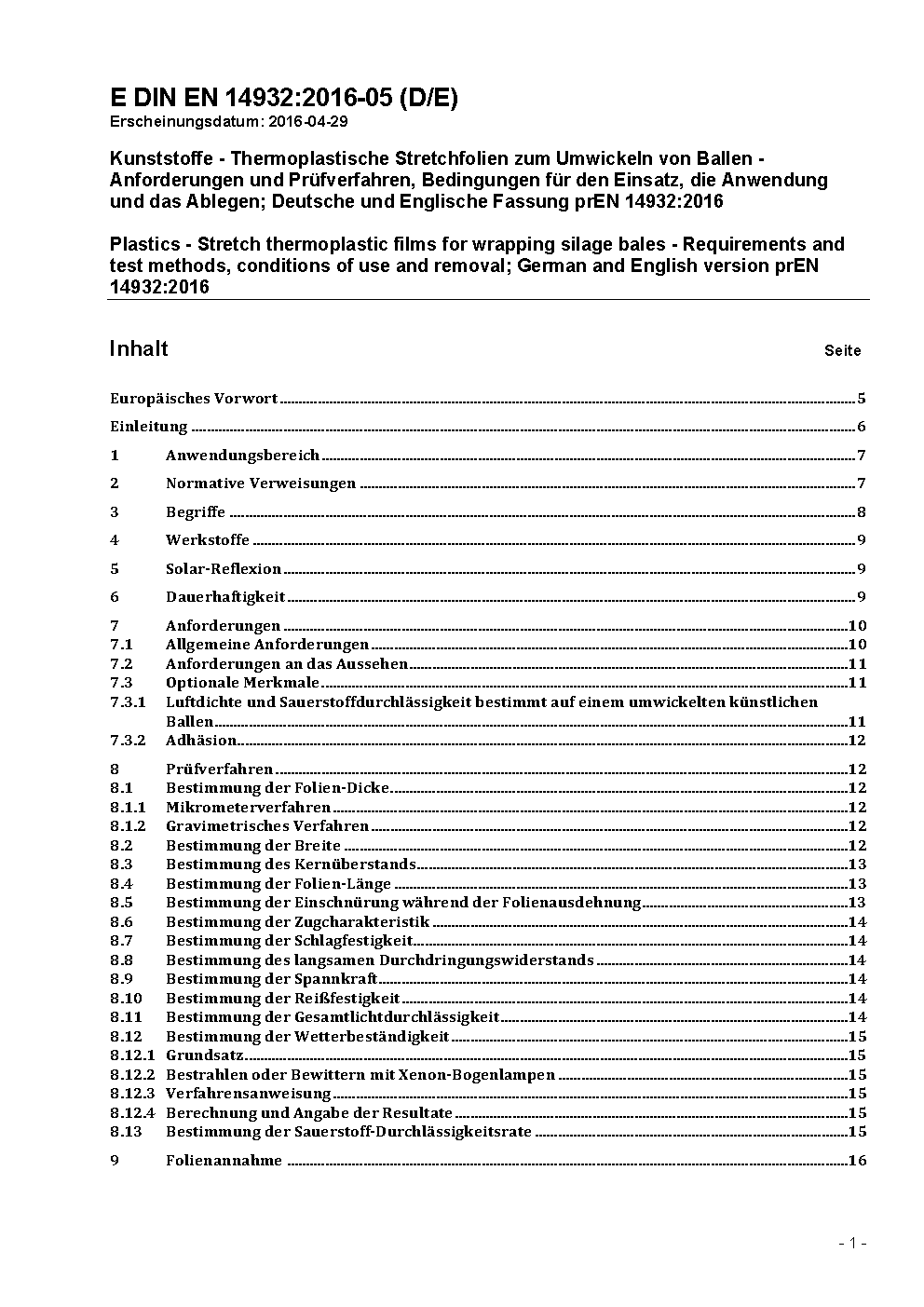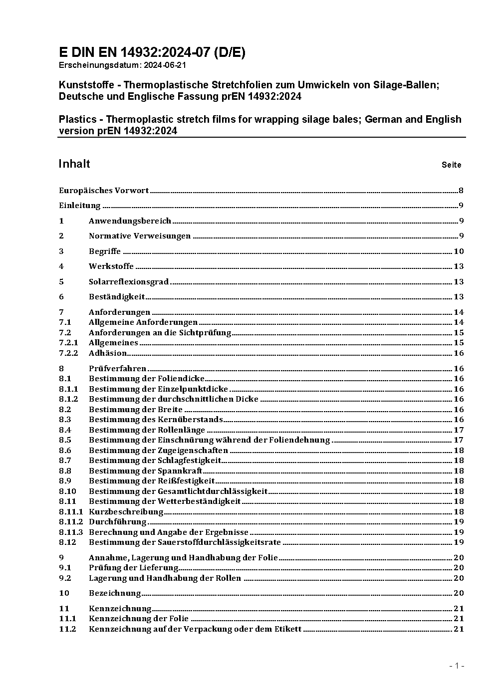 Kunststoffe - Thermoplastische Stretchfolien zum Umwickeln von Silage-Ballen; Deutsche Fassung EN 14932:2018