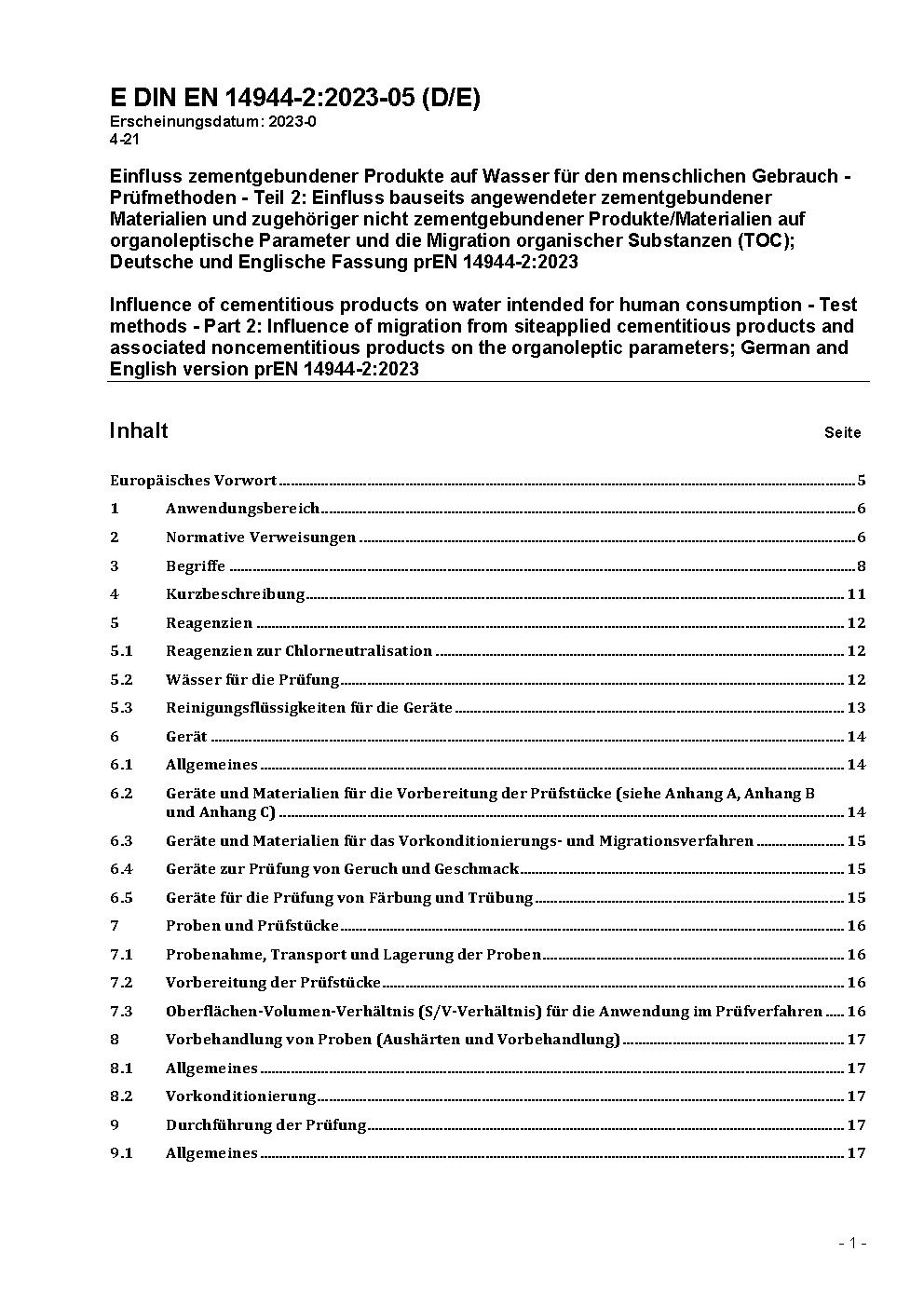 Einfluss zementgebundener Produkte auf Wasser für den menschlichen Gebrauch - Prüfmethoden - Teil 2: Einfluss bauseits angewendeter zementgebundener Materialien und zugehöriger nicht zementgebundener Produkte/Materialien auf organoleptische Parameter und die Migration organischer Substanzen (TOC); Deutsche und Englische Fassung prEN 14944-2:2023