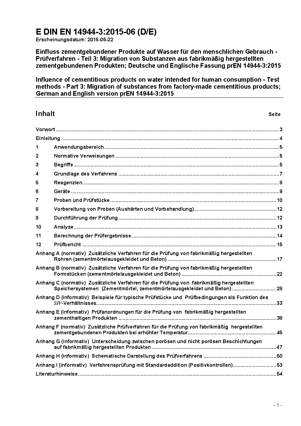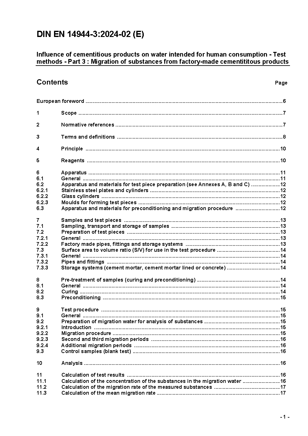 Einfluss von zementgebundenen Produkten auf Wasser für den menschlichen Gebrauch - Prüfverfahren - Teil 3: Migration von Substanzen aus fabrikmäßig hergestellten zementgebundenen Produkten; Deutsche Fassung EN 14944-3:2007