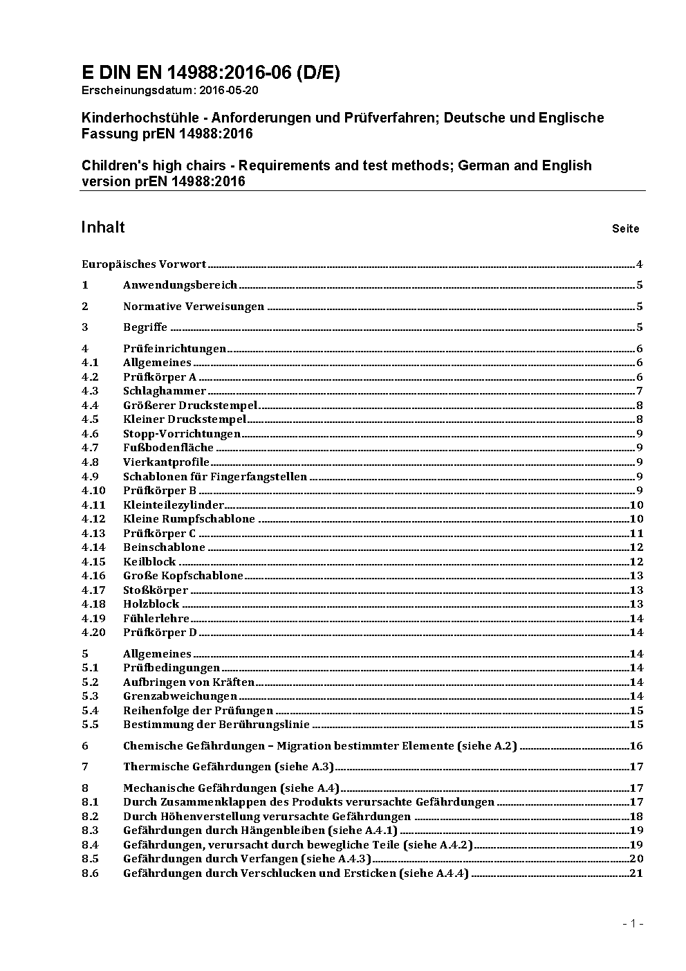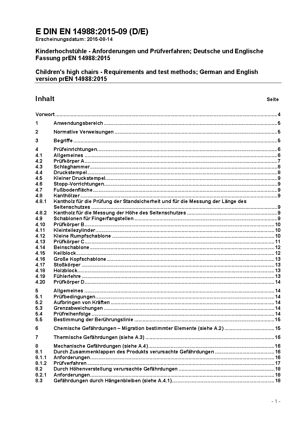 Kinderhochstühle - Anforderungen und Prüfverfahren; Deutsche und Englische Fassung prEN 14988:2016