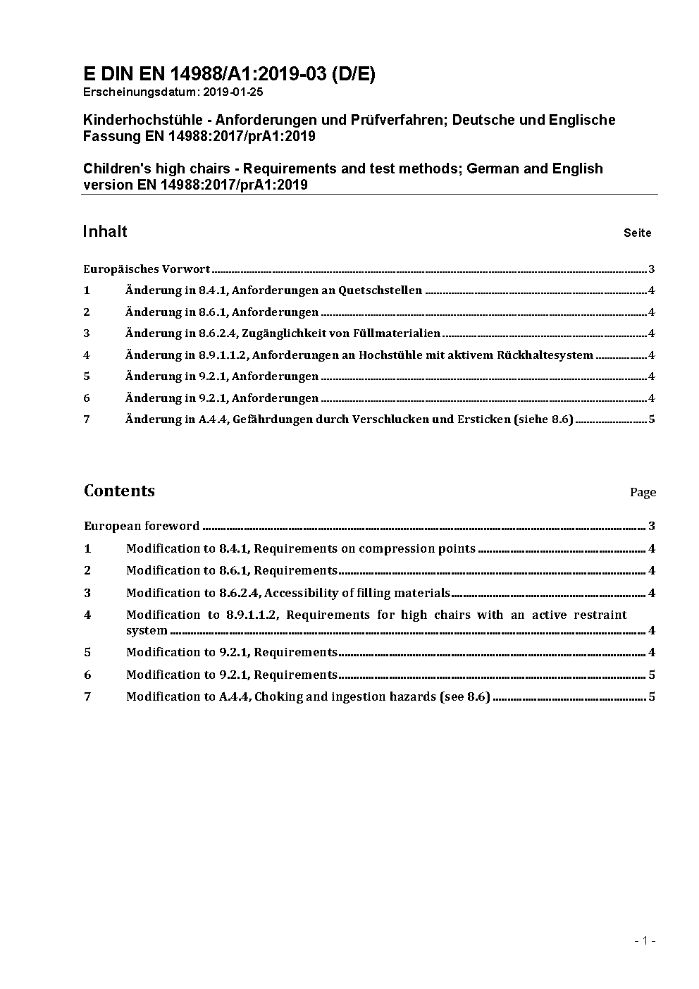 Children's high chairs - Requirements and test methods; German and English version prEN 14988:2016