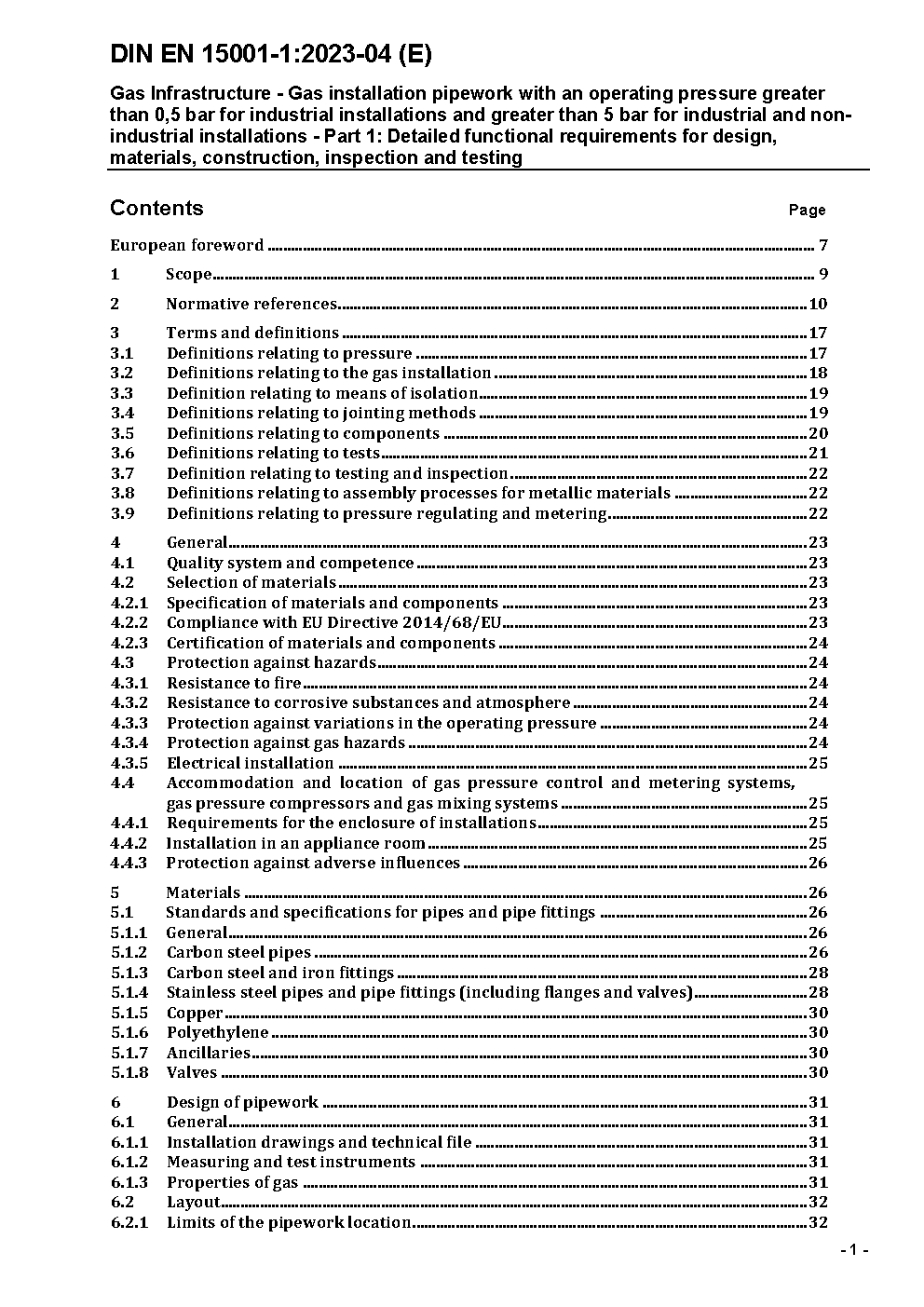 Gas supply systems - Gas installation pipework with an operating pressure greater than 0,5 bar for industrial, commercial and non-domestic gas installations - Part 1: Detailed functional requirements for design, materials, construction, inspection and testing; German version prEN 15001-1:2004