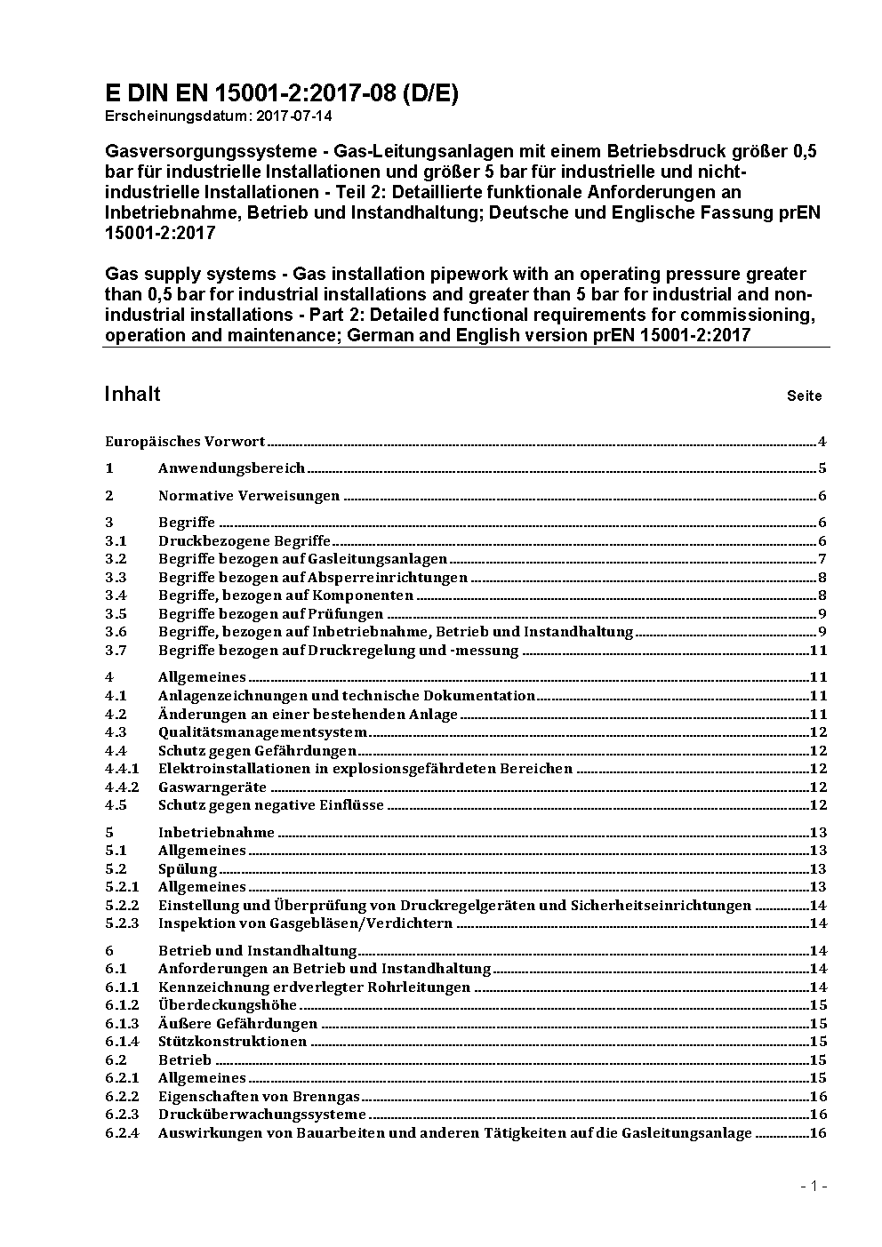 Gasinfrastruktur - Gas-Leitungsanlagen mit einem Betriebsdruck größer 0,5 bar für industrielle Installationen und größer 5 bar für industrielle und nicht-industrielle Installationen - Teil 2: Detaillierte funktionale Anforderungen an Inbetriebnahme, Betrieb und Instandhaltung; Deutsche Fassung EN 15001-2:2008