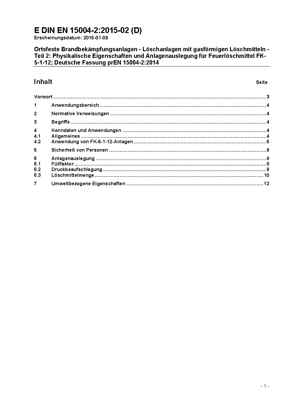 Ortsfeste Brandbekämpfungsanlagen - Löschanlagen mit gasförmigen Löschmitteln - Teil 2: Physikalische Eigenschaften und Anlagenauslegung für Feuerlöschmittel FK-5-1-12 (ISO 14520-5, modifiziert); Deutsche Fassung prEN 15004-2:2007