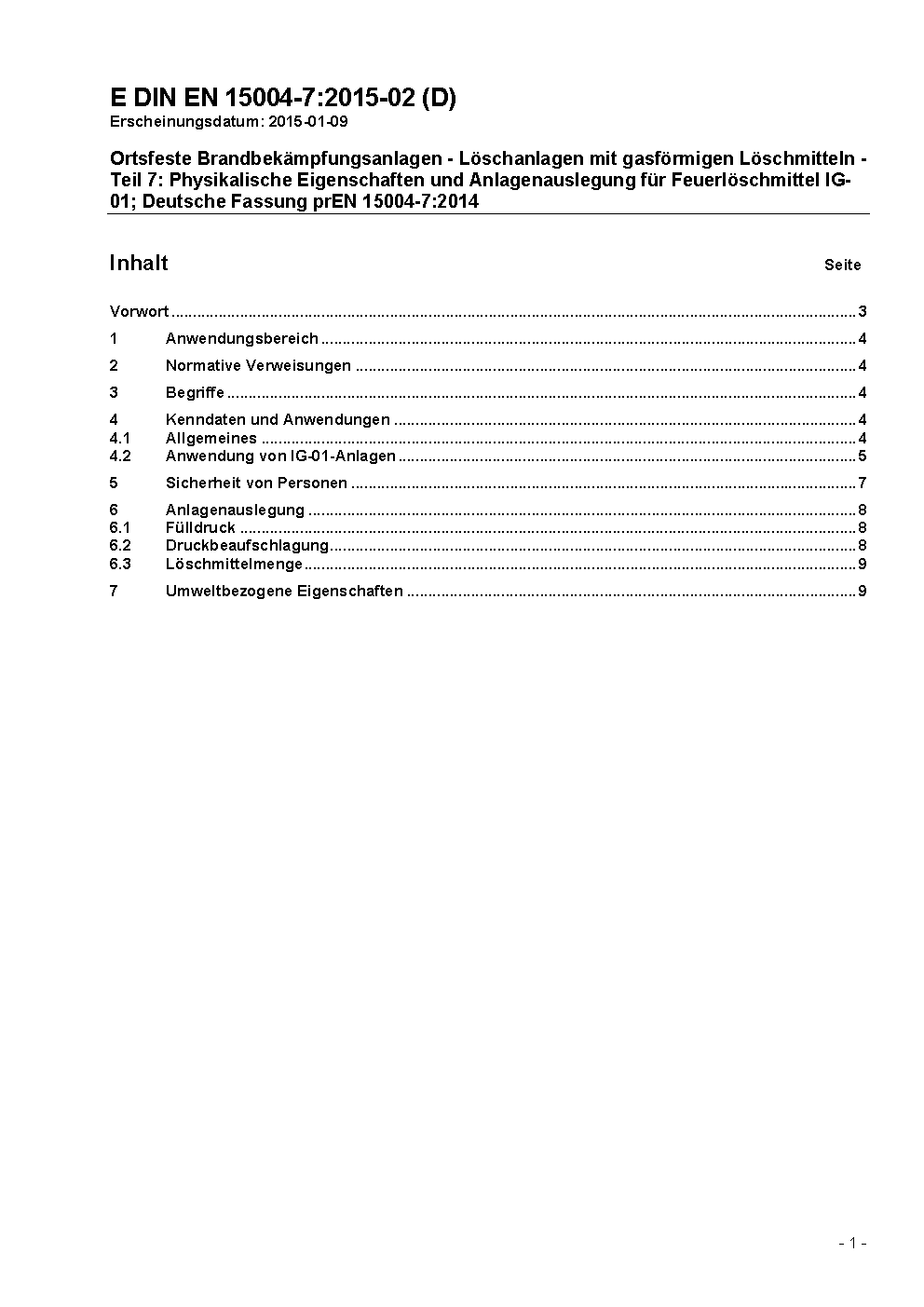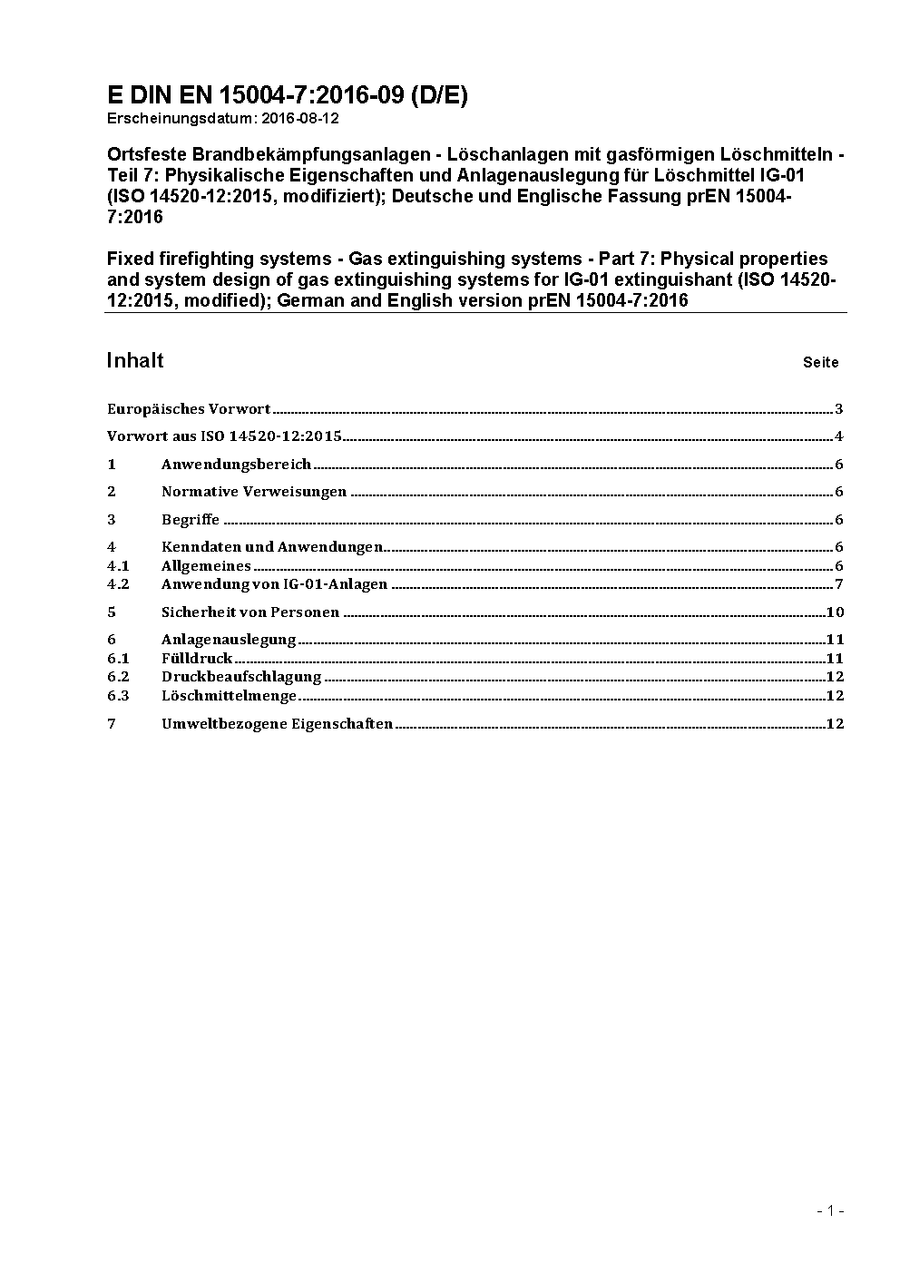 Ortsfeste Brandbekämpfungsanlagen - Löschanlagen mit gasförmigen Löschmitteln - Teil 7: Physikalische Eigenschaften und Anlagenauslegung für Feuerlöschmittel IG-01 (ISO 14520-12, modifiziert); Deutsche Fassung prEN 15004-7:2007