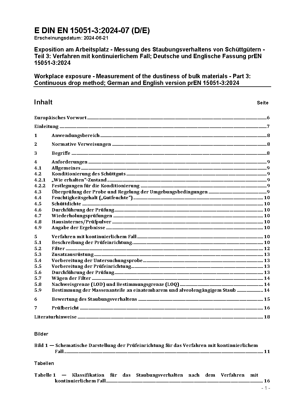 Exposition am Arbeitsplatz - Messung des Staubungsverhaltens von Schüttgütern - Teil 3: Verfahren mit kontinuierlichem Fall; Deutsche Fassung prEN 15051-3:2011