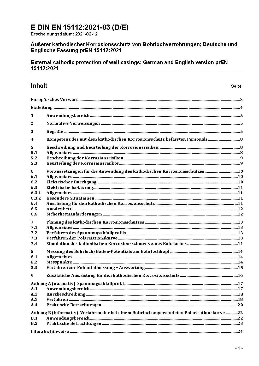 Äußerer kathodischer Korrosionsschutz von Bohrlochverrohrungen; Deutsche Fassung EN 15112:2006