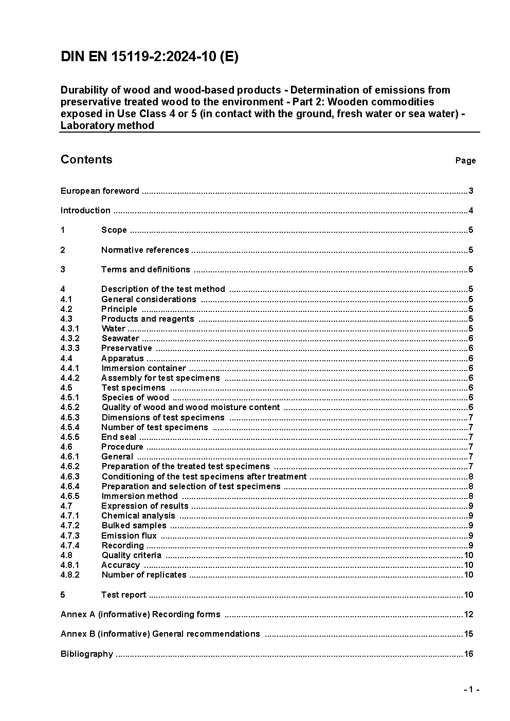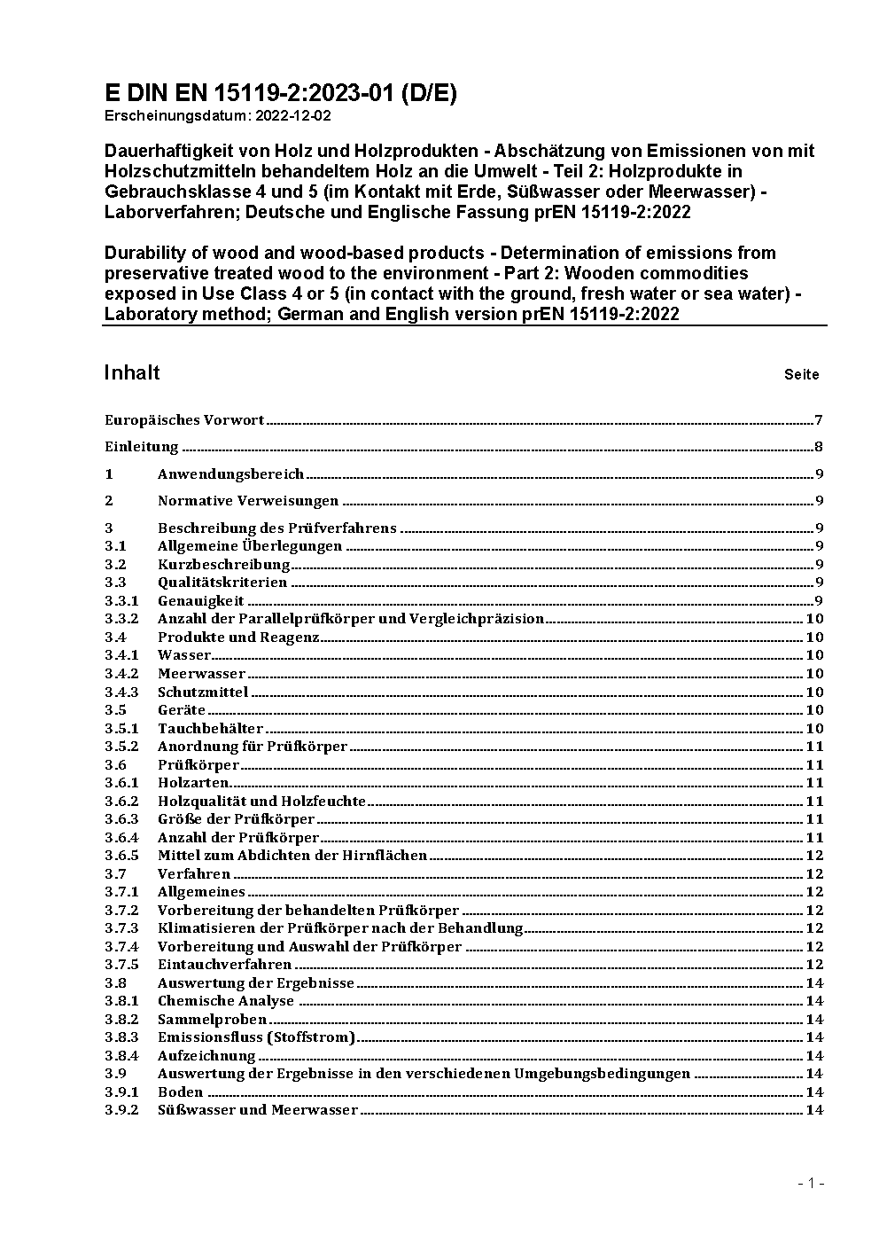 Durability of wood and wood-based products - Determination of emissions from preservative treated wood to the environment - Part 2: Wooden commodities exposed in Use Class 4 or 5 (in contact with the ground, fresh water or sea water) - Laboratory method; German and English version prEN 15119-2:2022