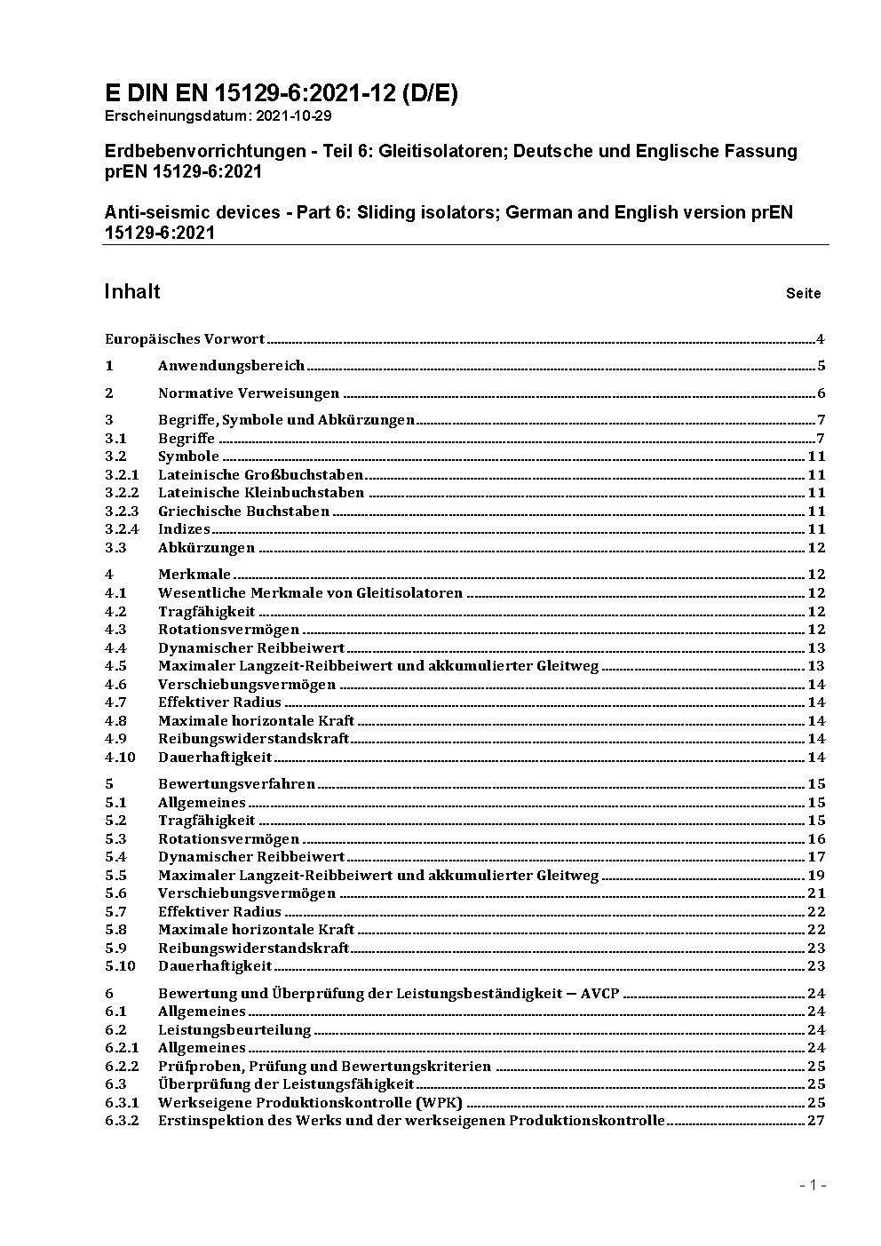 Erdbebenvorrichtungen - Teil 6: Gleitisolatoren; Deutsche und Englische Fassung prEN 15129-6:2021
