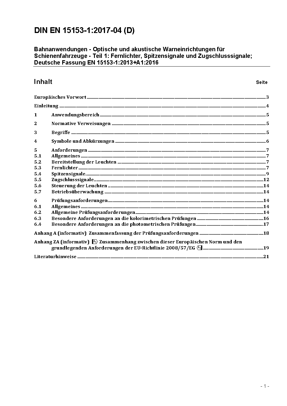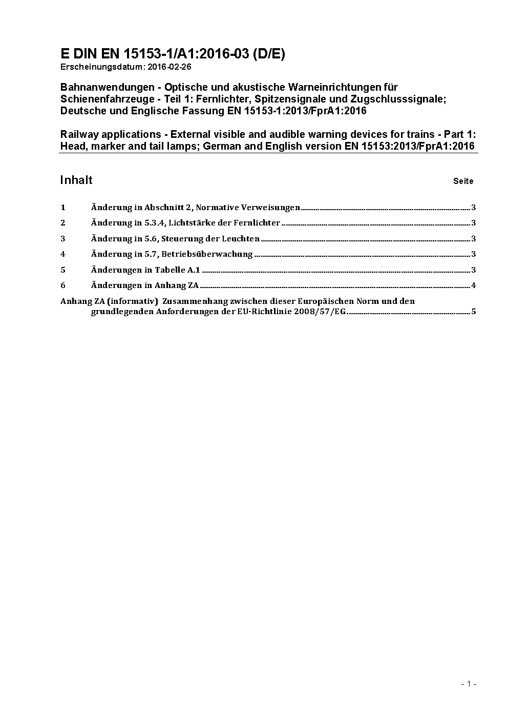 Bahnanwendungen - Optische und akustische Warneinrichtungen für Schienenfahrzeuge - Teil 1: Fernlichter, Spitzensignale und Zugschlusssignale; Deutsche Fassung EN 15153-1:2013+A1:2016