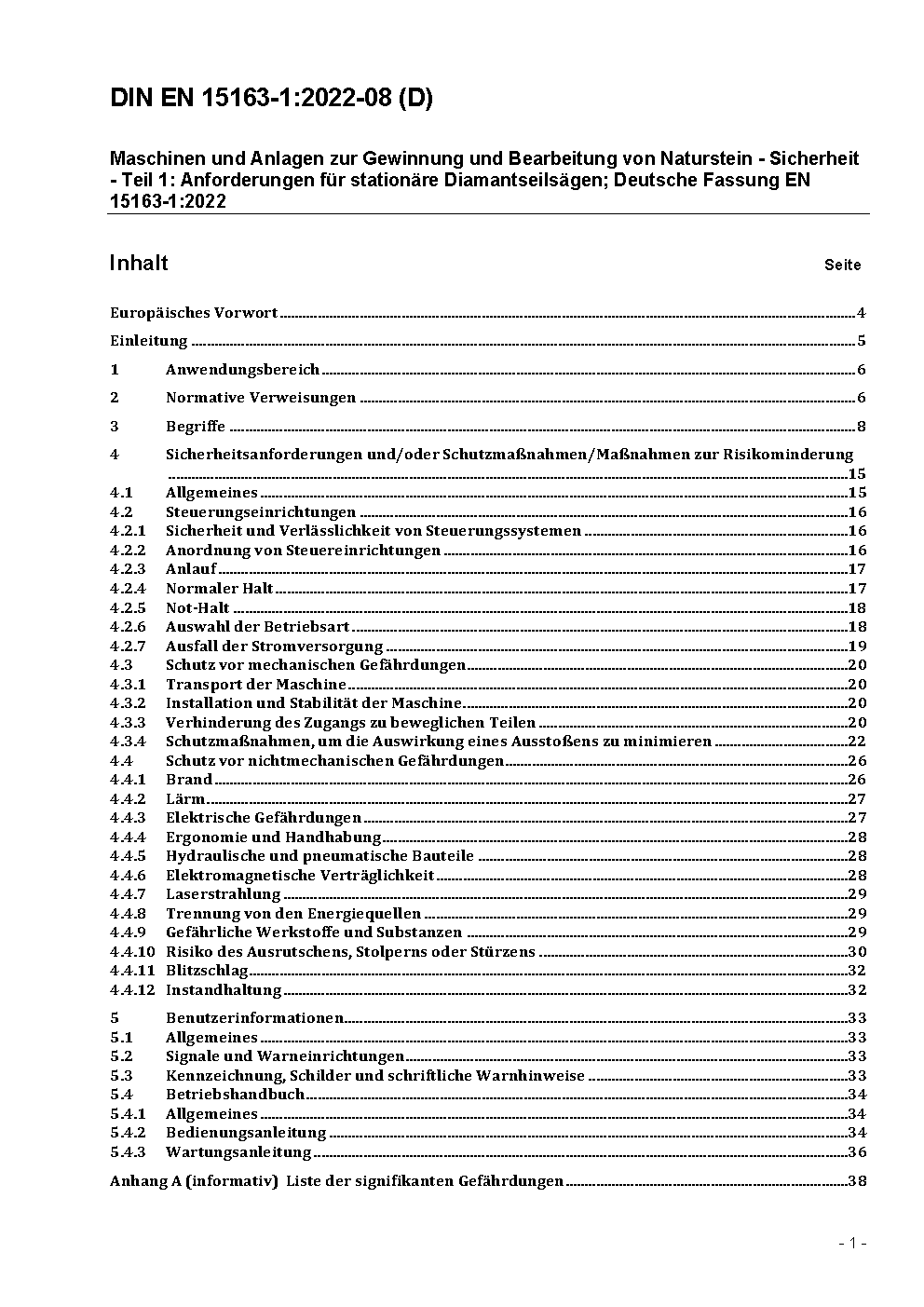 Maschinen und Anlagen zur Gewinnung und Bearbeitung von Naturstein - Sicherheit - Teil 1: Anforderungen für stationäre Diamantseilsägen; Deutsche Fassung EN 15163-1:2022